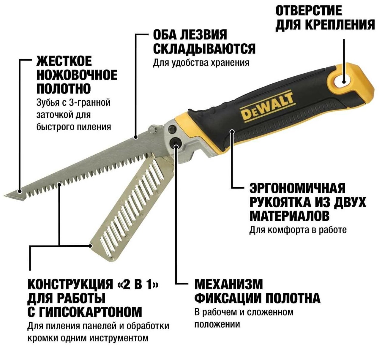 Складная ножовка по гипсокартону DEWALT. Конструкция «2 в 1» для удобства работы с гипсокартоном: возможность пиления панелей и обработки кромки с помощью одного инструмента. Жесткое ножовочное полотно с зубьями с 3-гранной заточкой для быстрого пиления. Лезвие рашпиля из нержавеющей стали для быстрого снятия материала. Механизм фиксации полотна в рабочем и сложенном положении. Оба лезвия складываются, обеспечивая удобство хранения. Эргономичная рукоятка из двух материалов для надежного захвата и комфорта в работе