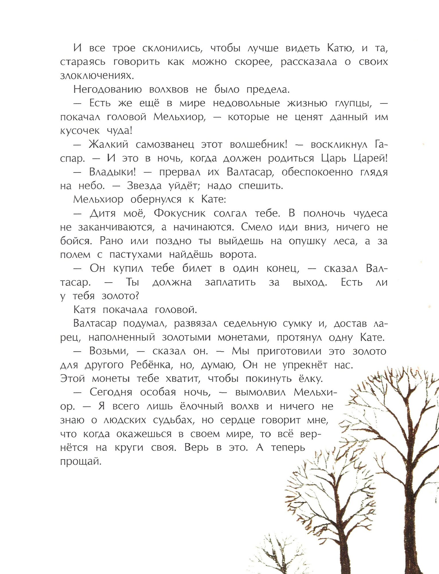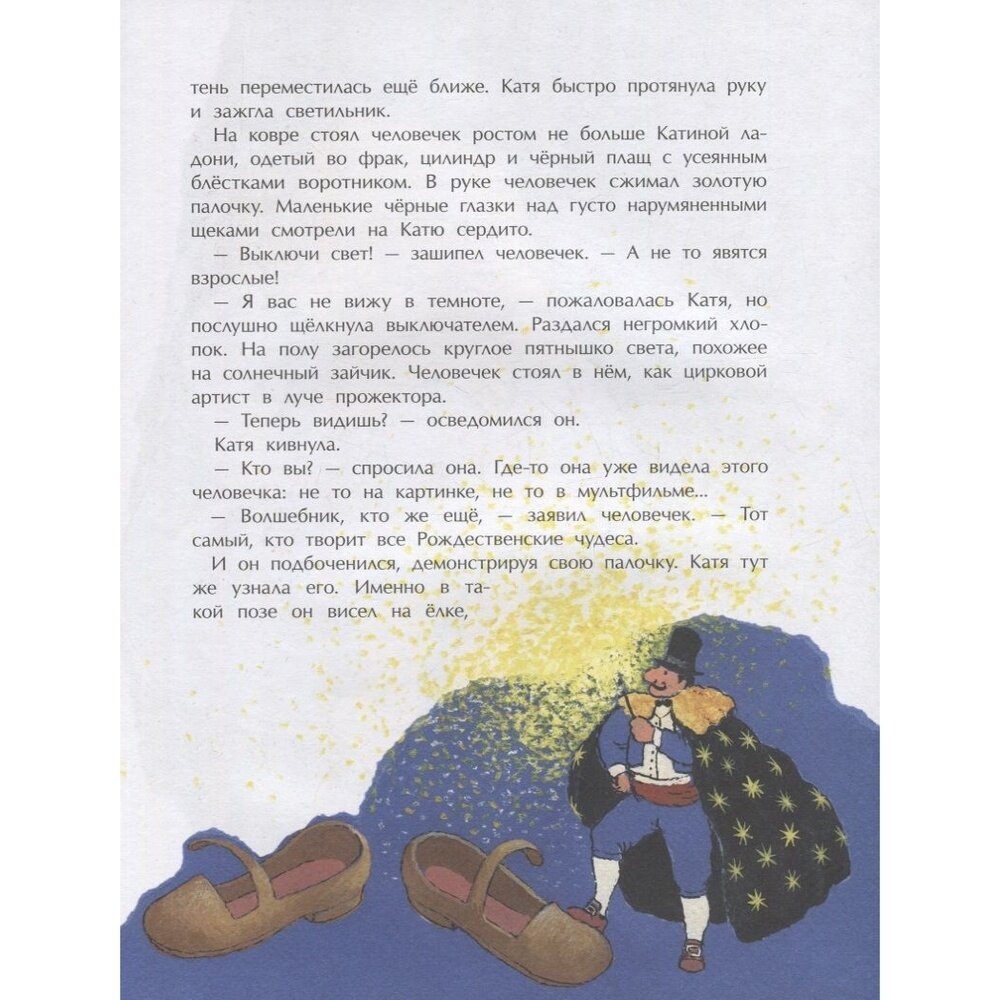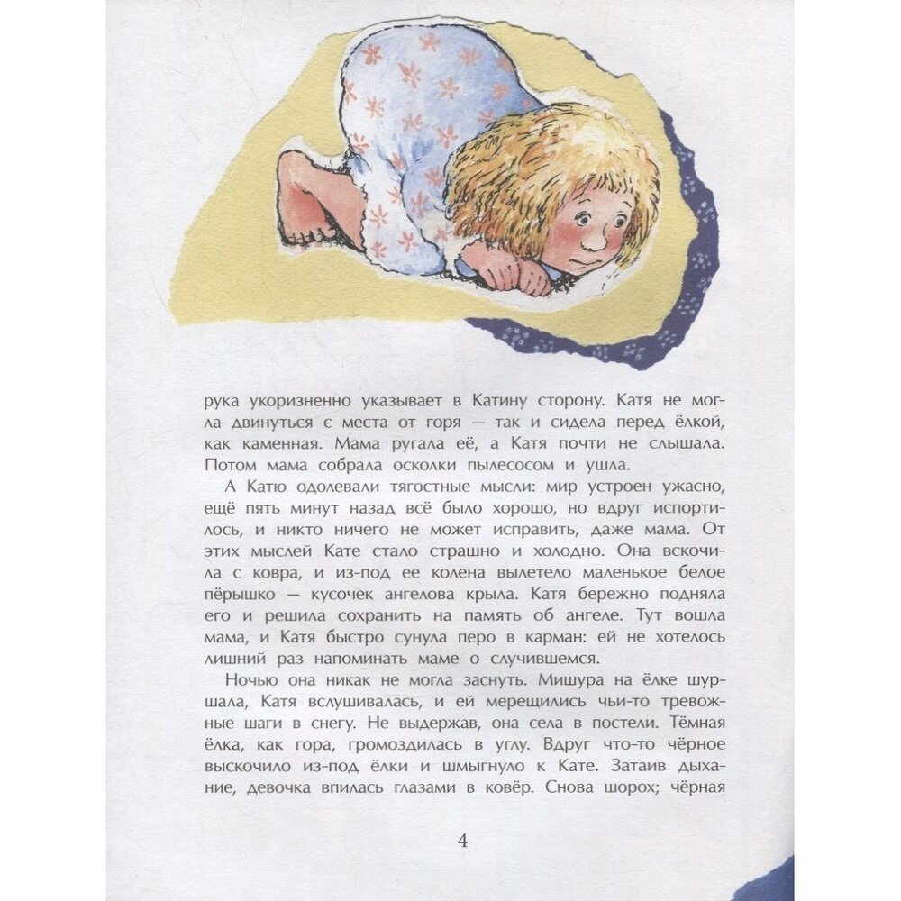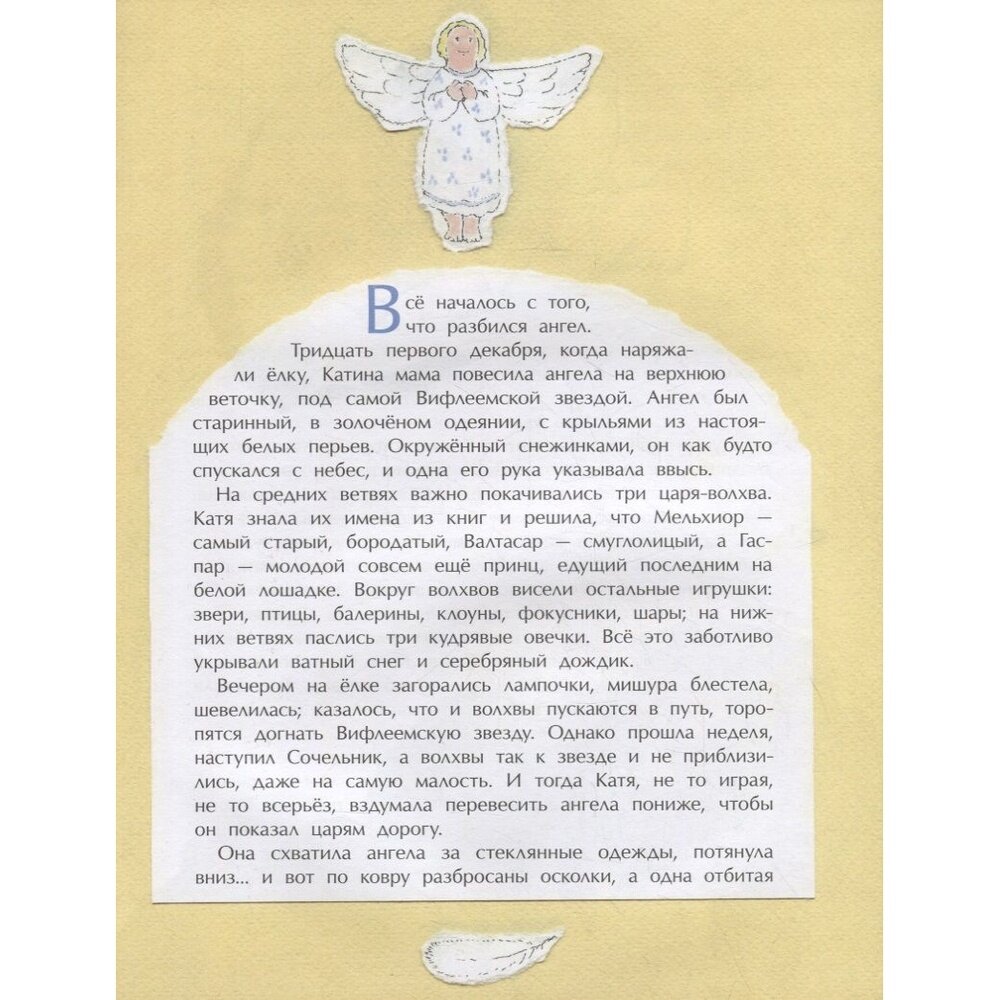 Прекрасная Рождественская сказка, где, словно в детстве, светится большая нарядная ёлка, оживают ёлочные игрушки, происходят чудеса. В Рождественский Сочельник, как и положено в сказке, девочке Кате приходится пережить волшебное путешествие, пройти через испытания и опасности. Она оказывается среди библейских героев, там, где ждут рождения Младенца. И хотя к её огромному огорчению украшавший ёлку старинный стеклянный ангел разбился, Катя, бережно сохранившая белое пёрышко от его крыла, самоотверженно стремится сделать всё, чтобы не прерывалось вечное движение Рождественских событий. И Рождество наступает...