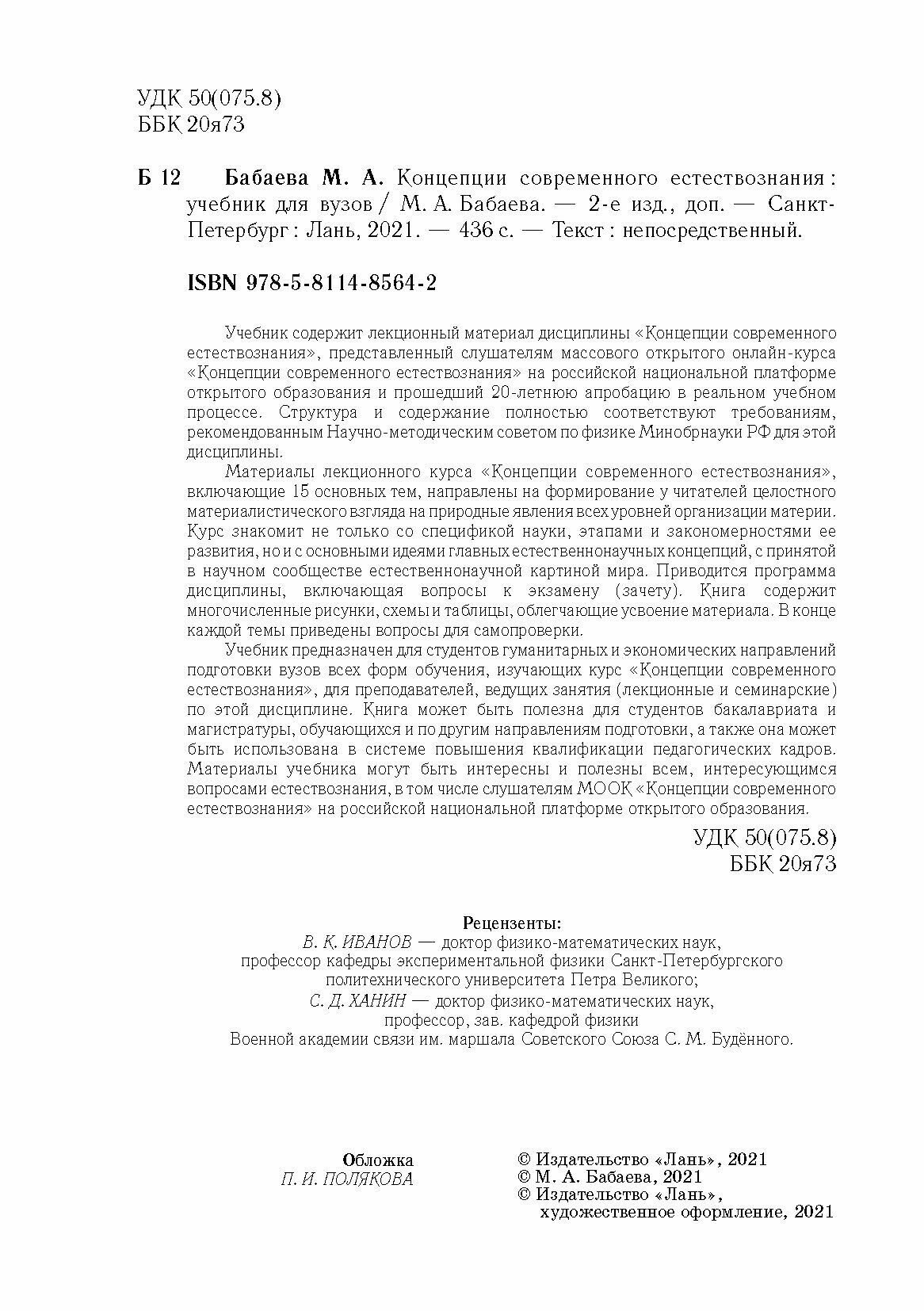 Концепции современного естествознания.Уч2изд (Бабаева Марина Алексеевна); Лань, 2021
