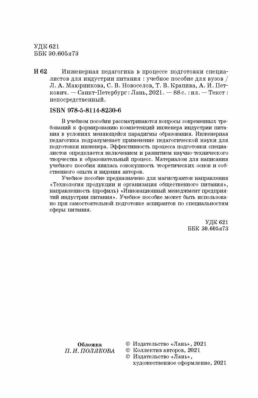 Инженерная педагогика в проц.подг.для индуст.питан (Маюрникова Лариса Александровна, Новоселов Сергей Владимирович, Крапива Татьяна Валерьевна); Лань, 2021