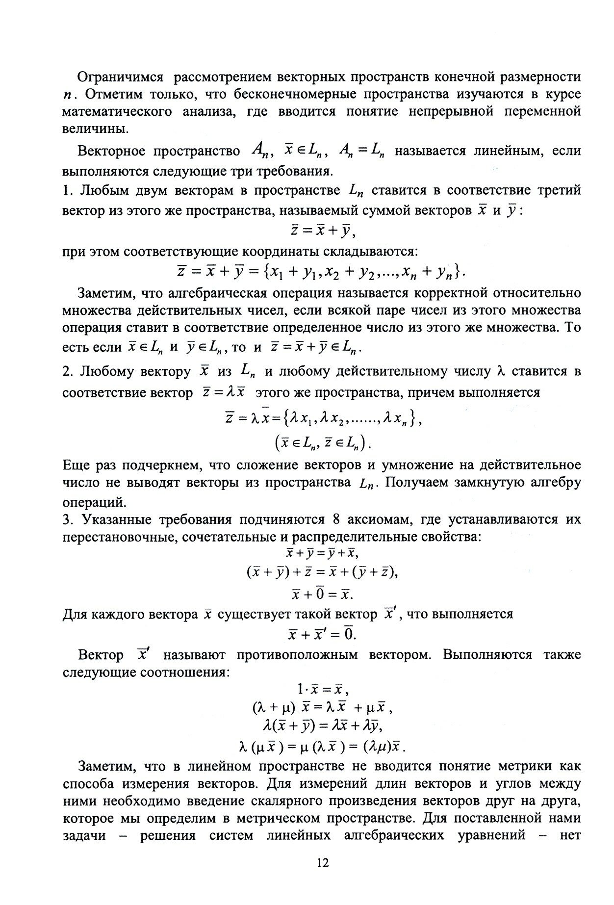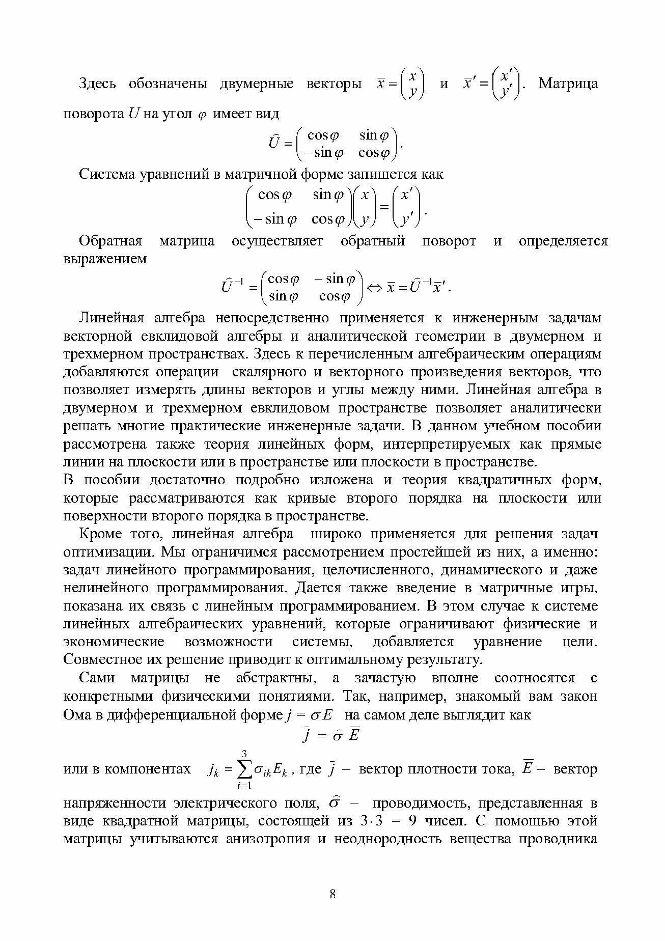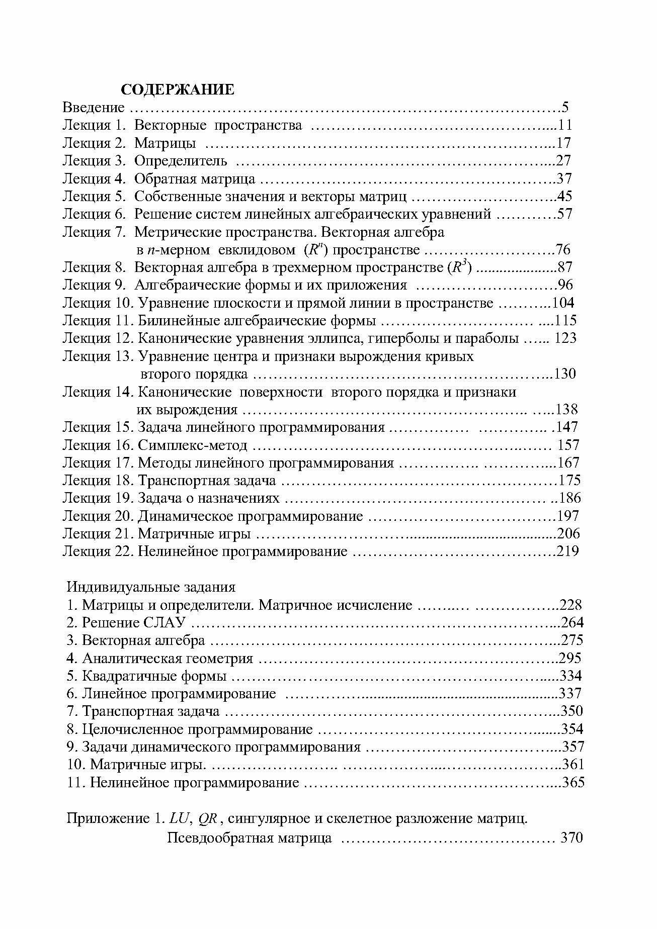 Учебник содержит основные теоретические положения линейной алгебры и некоторые ее практические приложения, такие как матричное исчисление, векторная алгебра и аналитическая геометрия в двумерном и трехмерном евклидовом пространстве, что позволяет решать практические инженерные задачи. Большое внимание уделено рассмотрению квадратичных форм и их геометрической иллюстрации. Кроме того, в данном пособии рассмотрено такое интересное приложение линейной алгебры, как многомерное математическое программирование, с помощью которого решаются различные задачи оптимизации. Учебник построен в виде лекций, а так же практических занятий. Содержит решение типовых примеров и в него включен большой набор типовых индивидуальных заданий для самостоятельной работы студентов.