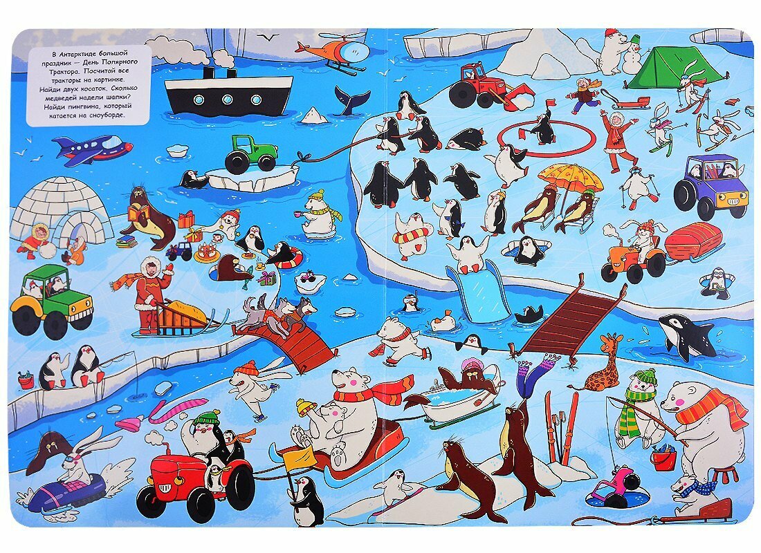 Добро пожаловать в необычный мир, где дружно живут люди, звери и... тракторы! Яркая картонная книга-виммельбух надолго увлечет и детей, и взрослых. Ведь здесь столько забавных и весёлых картинок, которые можно разглядывать часами. Интересные задания помогут тренировать внимательность. А ещё можно попросить ребёнка придумать свои истории про каждого персонажа для развития мышления и воображения.