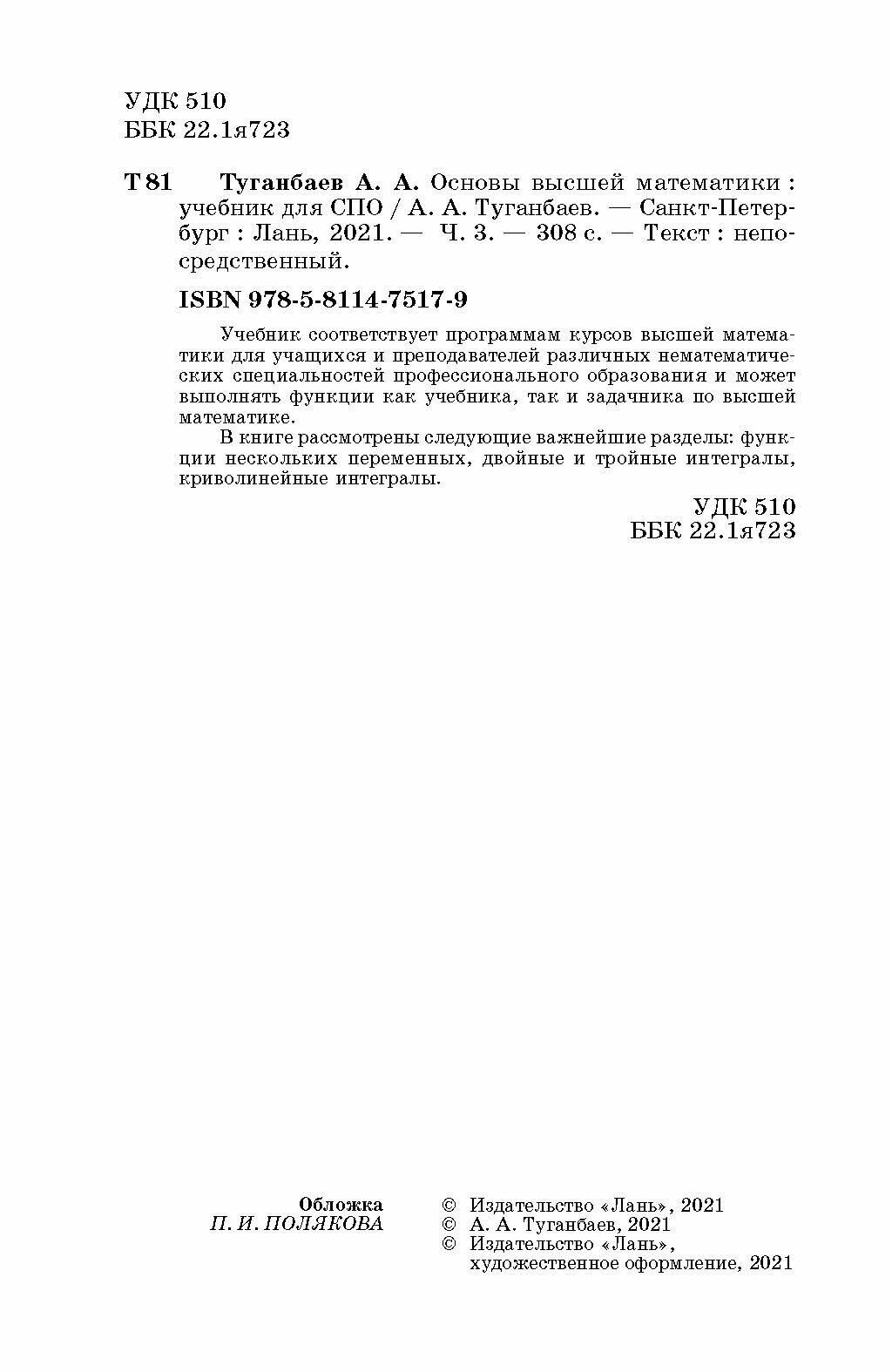 Основы высшей математики.Часть 3.Уч.СПО (Туганбаев Аскар Аканович); Лань, 2021