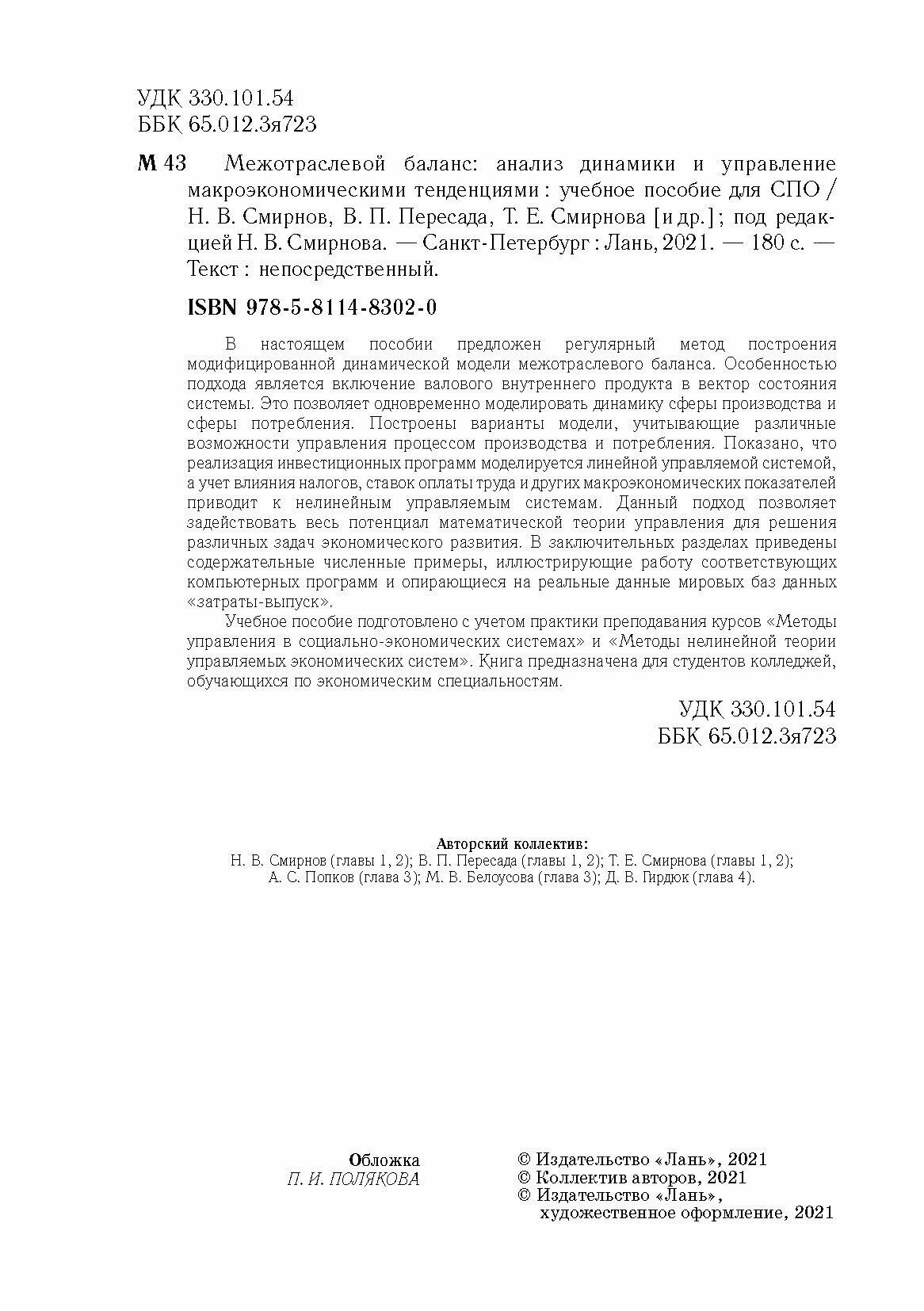 Межотраслевой баланс.Анализ динам.упр.макроэк.СПО (Смирнов Николай Васильевич, Пересада Виктор Петрович, Смирнова Татьяна Евгеньевна); Лань, 2021