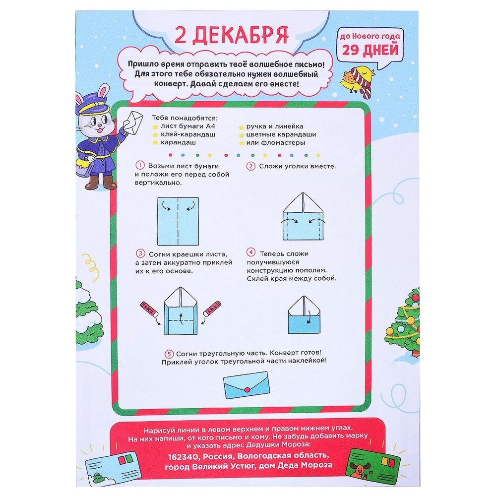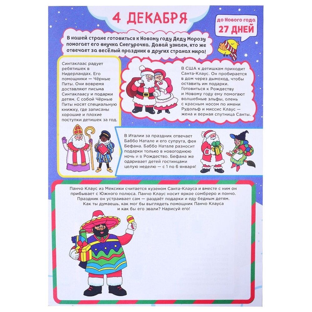 Новогодний адвент-календарь подарит каждому ребёнку настроение наступающего праздника. В нём собраны игры, увлекательные задания, ребусы, поделки на каждый день до наступления Нового года. С ними ждать праздника — гораздо веселее и интереснее! Внутри адве