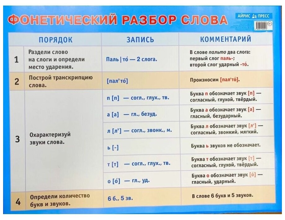 Новая от 26.12.2011: Это наглядное пособие универсально: плакат является самостоятельной частью комплекта по русскому языку для начальной школы и может быть использован как необходимое дополнение ко всем существующим сегодня курсам. Пособие отвечает Требованиям ФГОС, реализует в полном объеме деятельностный подход в обучении. На красочно оформленном плакате представлена таблица фонетического разбора слова, которая включает не только порядок (алгоритм) разбора слова и его запись, но и устный комментарий. Комментарий в структуре фонетического разбора, транскрипция слова существенно повышают функциональность и эффективность таблицы, как наглядного средства.