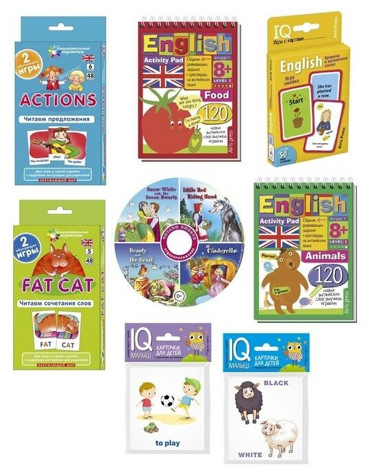Все пособия комплекта подобраны с учётом возрастных нейропсихологических особенностей детей и рассчитаны на изучение английского языка в игровой форме. Благодаря уникальным авторским методикам, "вшитым" в каждое пособие, в процессе весёлой игры ребёнок активно развивается. В комплект входят: - карточки "Умный малыш. English": "Противоположности" и "Действия"; - умные игры с картами "Времена в английском языке. Игра змейка";- IQ-блокноты: "Животные" и "Еда"; - занимательные карточки: "Толстый кот. Читаем сочетания слов" и "Действия. Читаем предложения"; - набор карточек "Учим английский играя. Уровень 4"; - CD "Читаем вместе. Сборник сказок". Организовать занятия под силу каждому - правила игр просты и понятны, а кроме того, к каждому комплекту прилагаются полезные советы для родителей. Для детей от 7 до 10 лет.