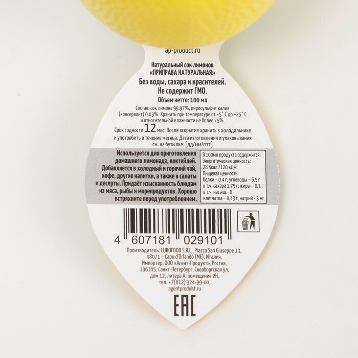 | Состав | Сок лимона 99.97%, пиросульфит калия (консервант) 0.03%. Сахара - 1,75 г, клетчатка - 0,43 г, натрий - 3 мг |