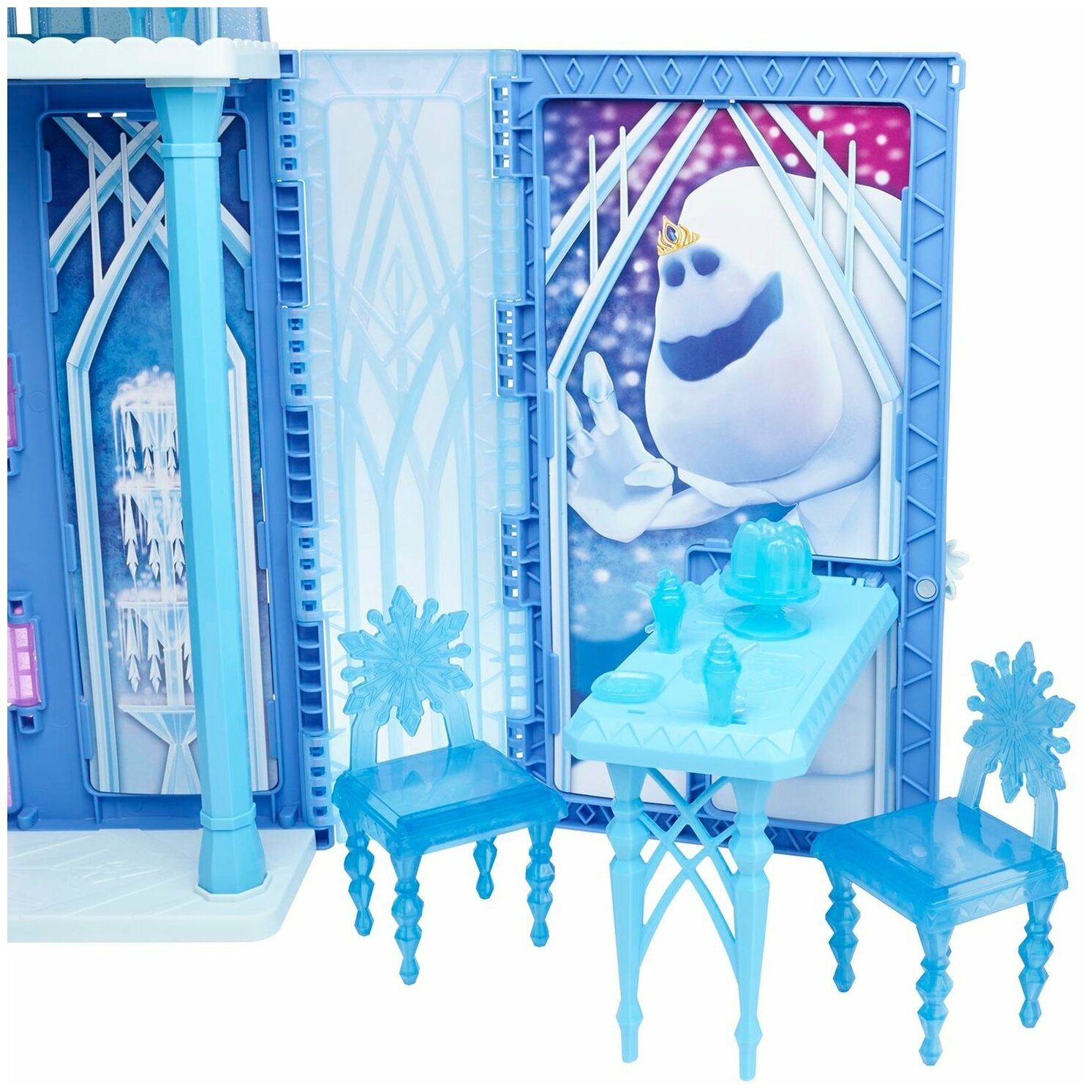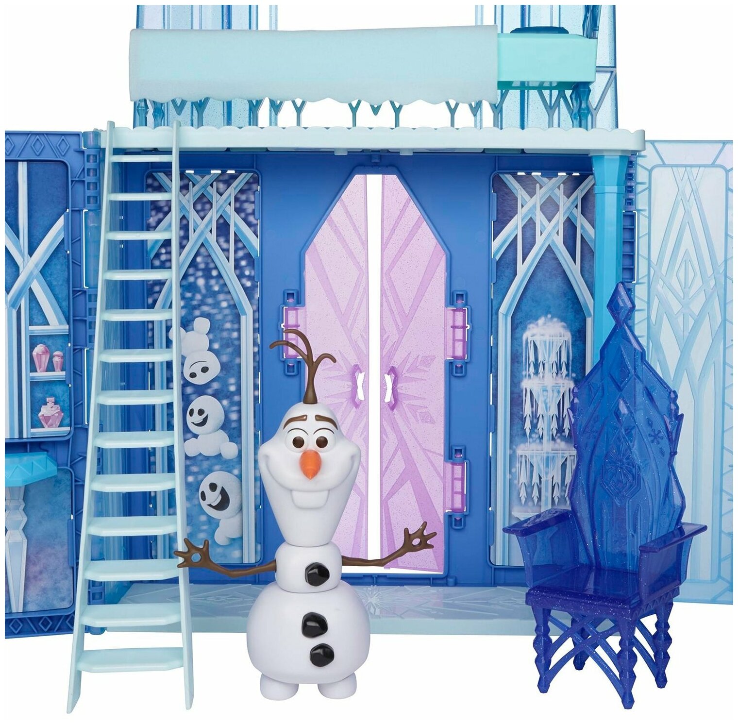 - В наборе представлены 20 аксессуаров, включая трон, кровать, одеяло, 2 стула, закуски, косметические аксессуары, а также фигурка снеговика Олафа!