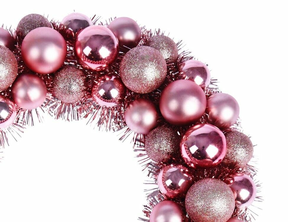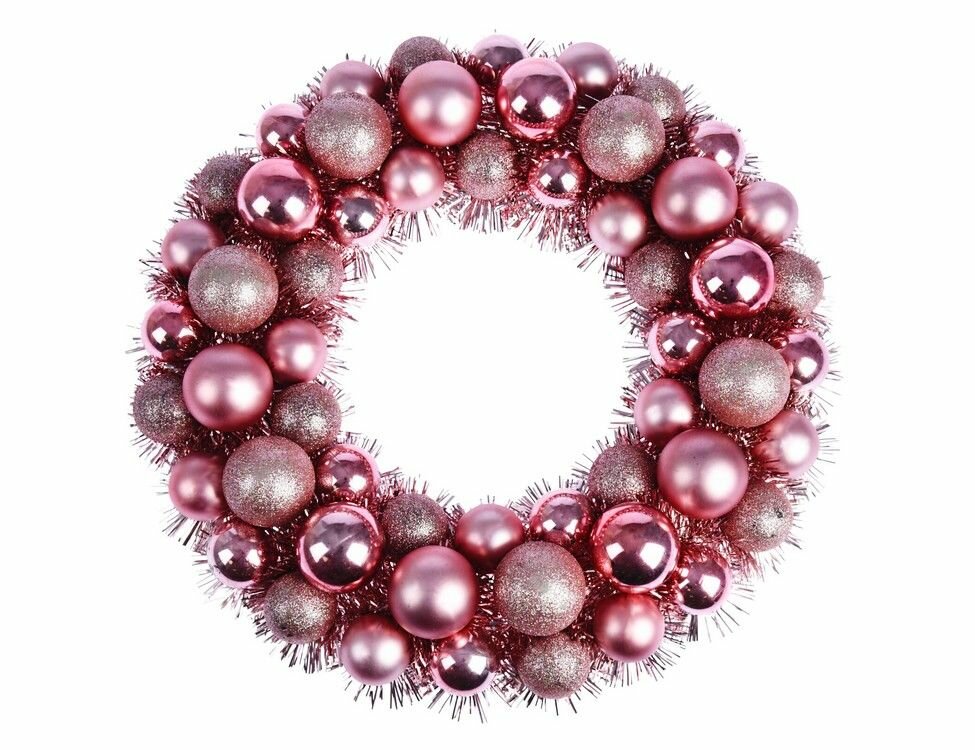 Сверкающий, украшенный новогодними шариками розовый декоративный венок переливается весёлыми бликами, которые щекочут настроение, словно брызги шампанского! На столе со свечой в центре или на входной двери - он обязательно вызовет улыбки и радость, как и самый праздничный из всех напитков! Характеристики:Диаметр - 39 см.Материал - полипропилен.Цвет - розовый. Производитель - Koopman International, Нидерланды.Производство размещено в Китае.