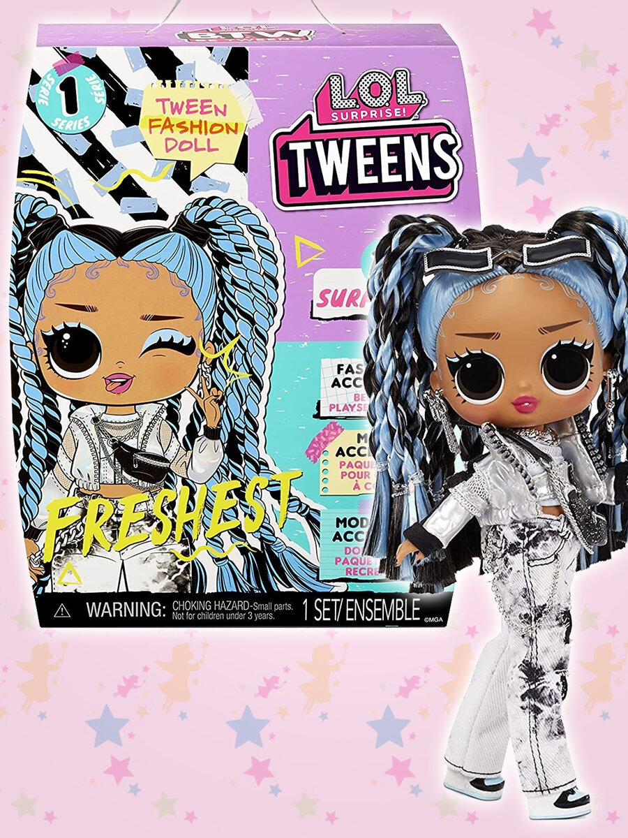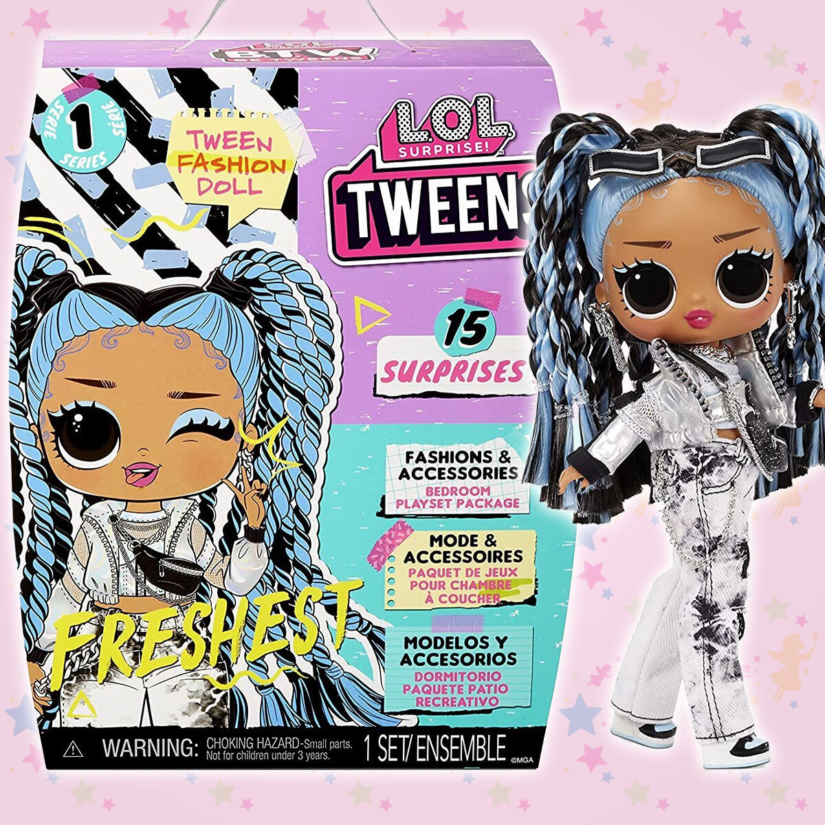 Сестренка LOL Surprise Tweens Doll- Freshest с черно-голубыми волнистыми волосами, заплетенными в 2 хвоста и карими глазами. Одета в короткий топ, серые джинсы-варенки, серебристую курточку и кеды. Высота 15 см. Шарнирные детали туловища позволяют принимать различные позы. Для удобства переодевания снимаются руки. Из аксессуаров у куколки несколько комплектов одежды, обувь, модные аксессуары, сумочка, расческа для волос и подставка.