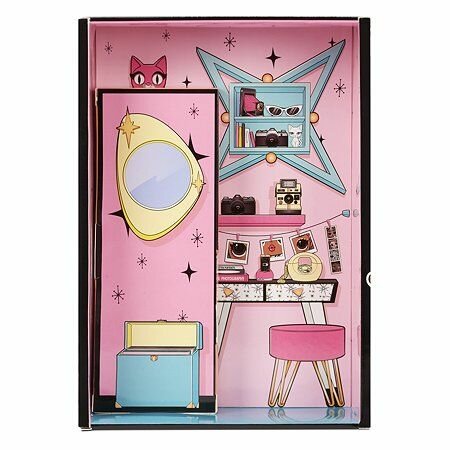 Упаковка представляет собой гардеробную комнату с ярким принтом. Аксессуары хранятся в чехлах для одежды, шляпной и обувной коробках.
