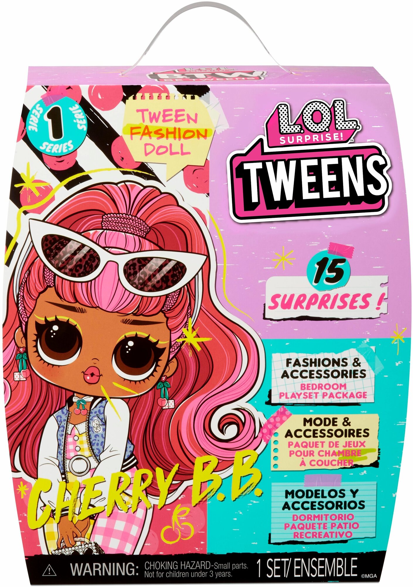 Сестренка LOL Surprise Tweens Doll Cherry B.B. с розовыми волнистыми волосами, убранными в высокий хвост и карими глазами. Одета в комбинированный костюм, состоящий из топа и брюк в клетку, джинсовую курточку и ботиночки на высоком каблуке. В руках сумочка. Высота 15 см. Шарнирные детали туловища позволяют принимать различные позы. Для удобства переодевания снимаются руки. Из аксессуаров у куколки несколько комплектов одежды, обувь, модные аксессуары, сумочка, расческа для волос и подставка.