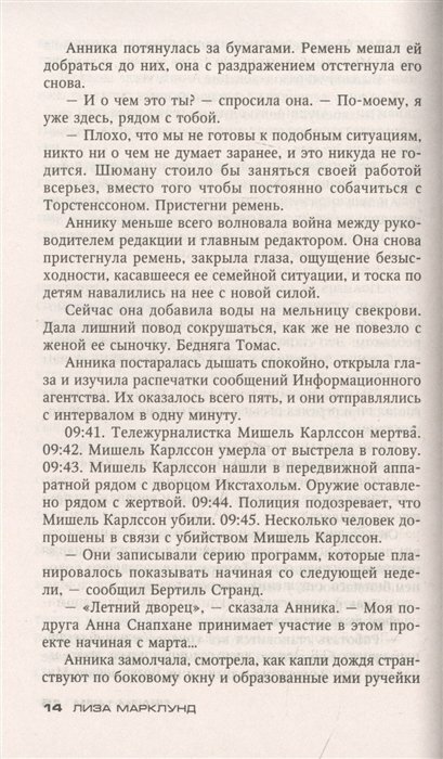 Неплохой герметичный детектив , напоминающий творчество Агаты Кристи , четвёртая книга из цикла про журналиста Аннику Бенгтзон. В основе сюжета история про убийство известной тележурналистики , число подозреваемых сразу ограничено , причем у каждого из них можно найти причины желать ей смерти. Одной из подозреваемых является близкая подруга Анники , поэтому это дело становится для неё особенно важным. Сюжет получился увлекательным , понять кто преступник сложно так как постоянно появляются новые факты.