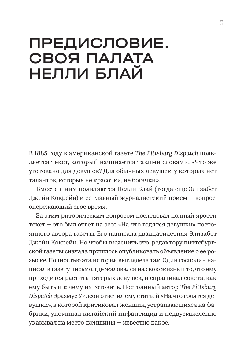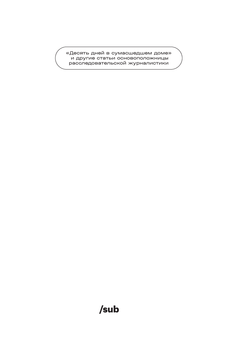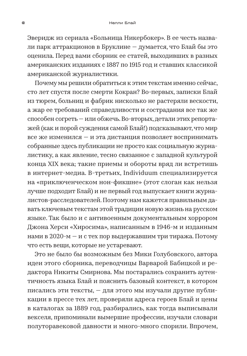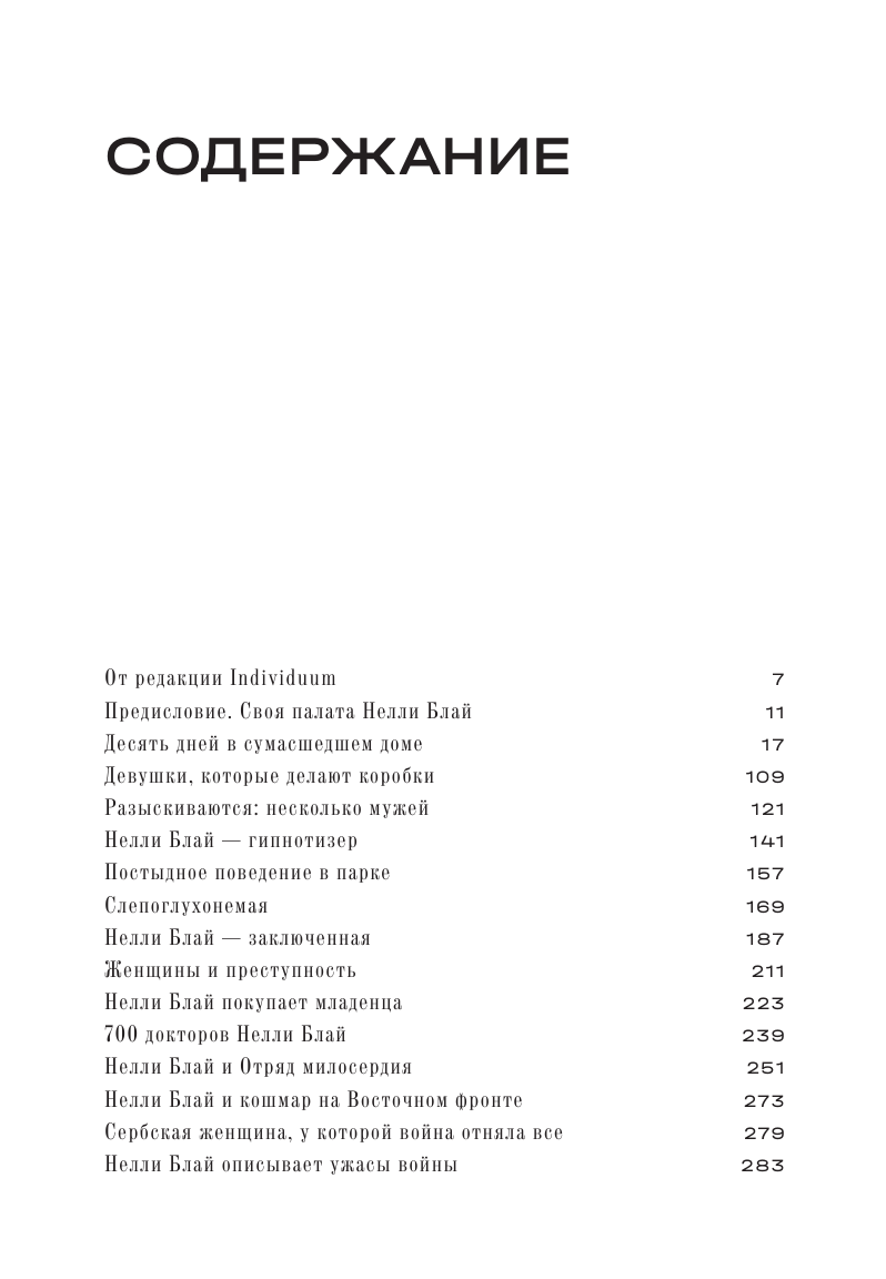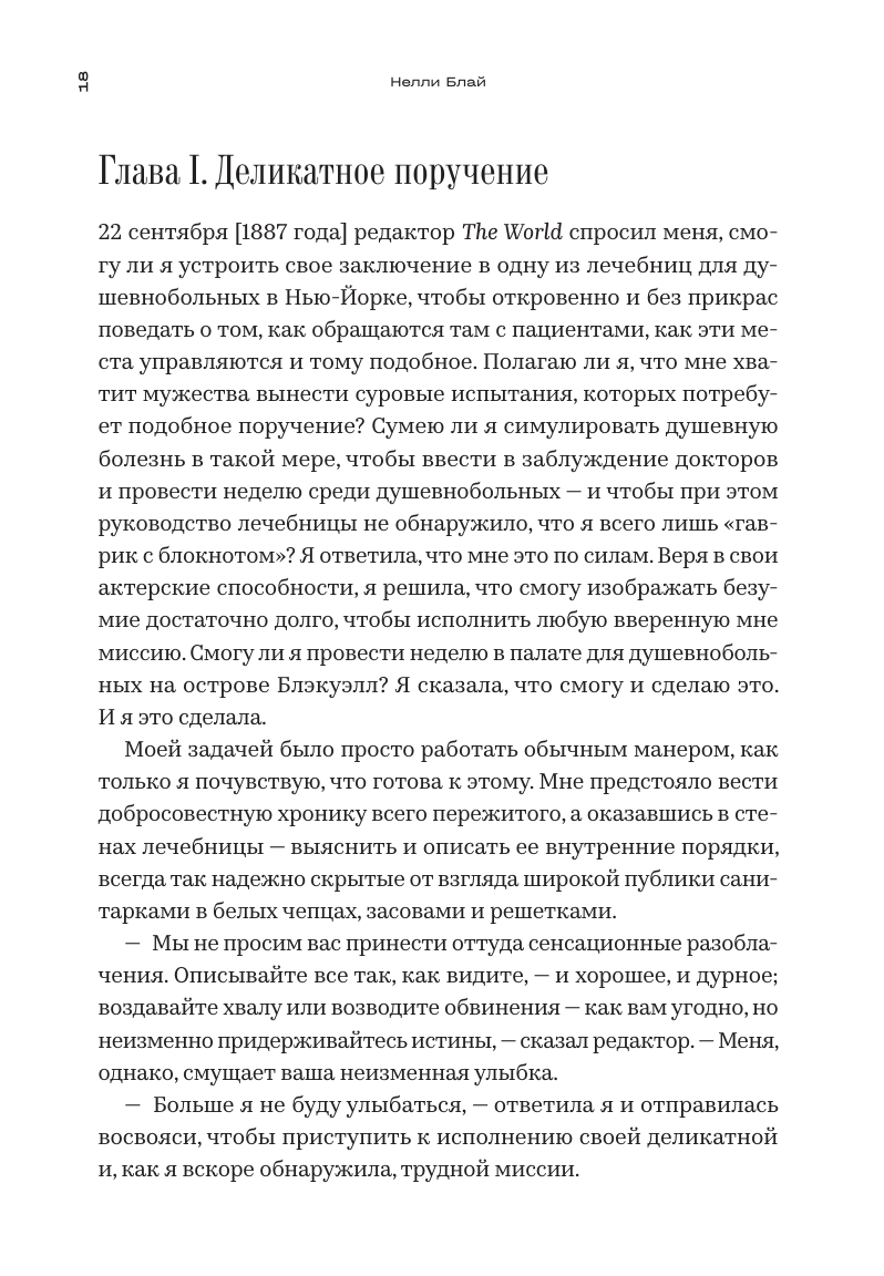 Современники называли ее Леди Сенсация за умение находить выдающиеся сюжеты, хотя для этого ей порой было достаточно присмотреться к окружающим или притвориться кем-то, кто выходит за рамки нормы. Впервые публикующиеся на русском языке, расследования Блай проливают свет на истоки новой журналистики и показывают, что многие обнаруженные ей проблемы не потеряли актуальности и по сей день.