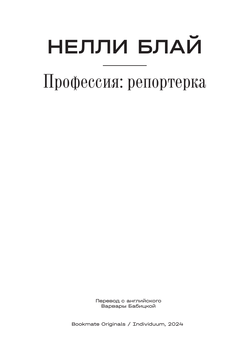 «Профессия: репортерка» — сборник лучших статей Элизабет Джейн Кокран (она же Нелли Блай), основоположницы жанра журналистского расследования и одной из первых корреспонденток в истории. Вас ждут приключения в «тиндере» конца XIX века и харассмент в парках Нью-Йорка, расследование системы принудительного психиатрического лечения, описание прекарного труда упаковщиц на фабрике, разоблачения фальшивых гипнотизеров и бизнеса по продаже младенцев. Она обращала внимание на несправедливость, угнетение слабых и бедственное положение женщин и в итоге добилась изменений в американском обществе — например, ее текст «Десять дней в сумасшедшем доме» спровоцировал реформу психиатрических учреждений.