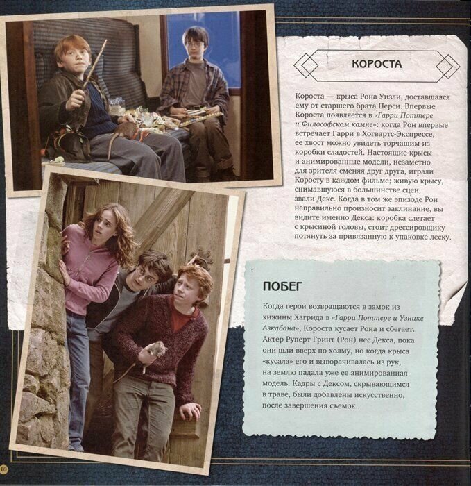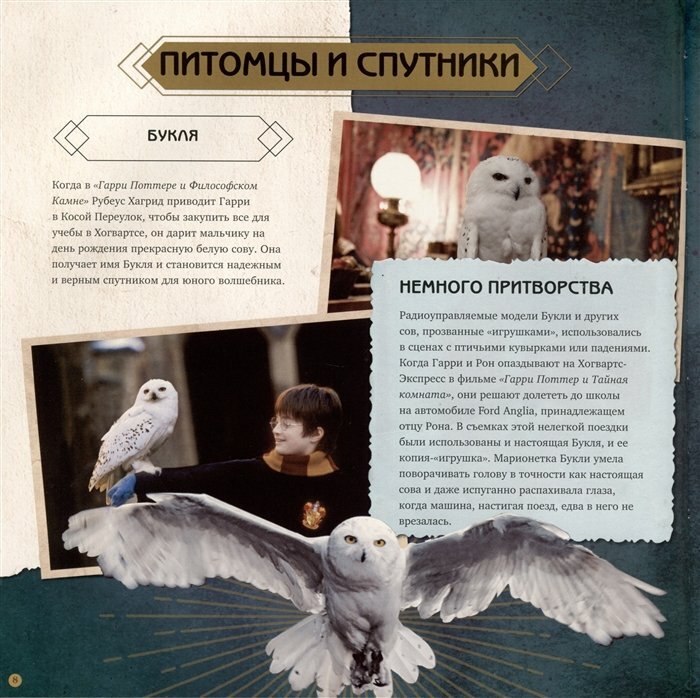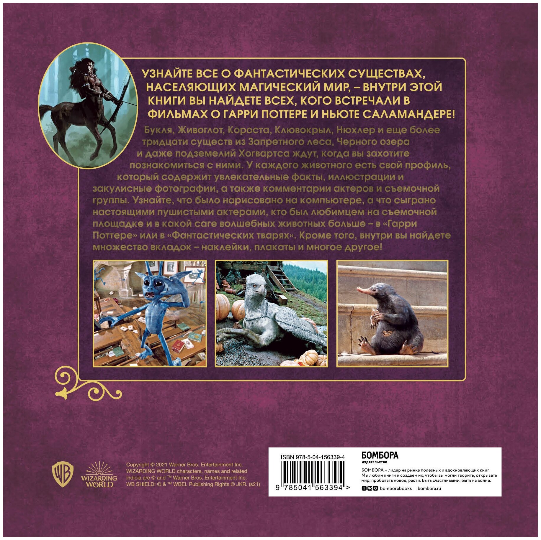Букля, Живоглот, Короста, Клювокрыл, Нюхль и еще более тридцати существ из Запретного леса, Черного озера и даже подземелий Хогвартса ждут, когда вы захотите познакомиться с ними. У каждого животного есть свой профиль, который содержит увлекательные факты, иллюстрации и закулисные фотографии, а также комментарии актеров и съемочной группы. Узнайте, что было нарисовано на компьютере, а что сыграно настоящими пушистыми актерами, кто был любимцем на съемочной площадке и в какой саге волшебных животных больше - в "Гарри Поттере" или "Фантастических тварях". Кроме того, внутри вы найдете множество вкладок - наклейки, плакаты и многое другое!