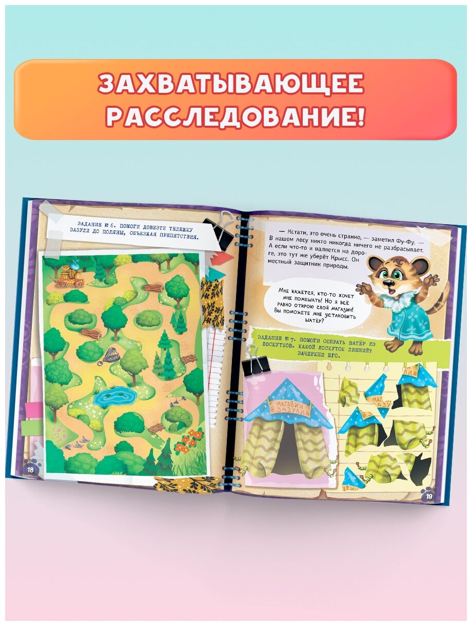 В книге есть цельный детективный сюжет и иллюстрации с заданиями на каждой странице! Ребенку предлагается вместе с сыщиками расследовать преступления и на каждой странице отгадать тайну: найти следы, пройти лабиринт и т.д.