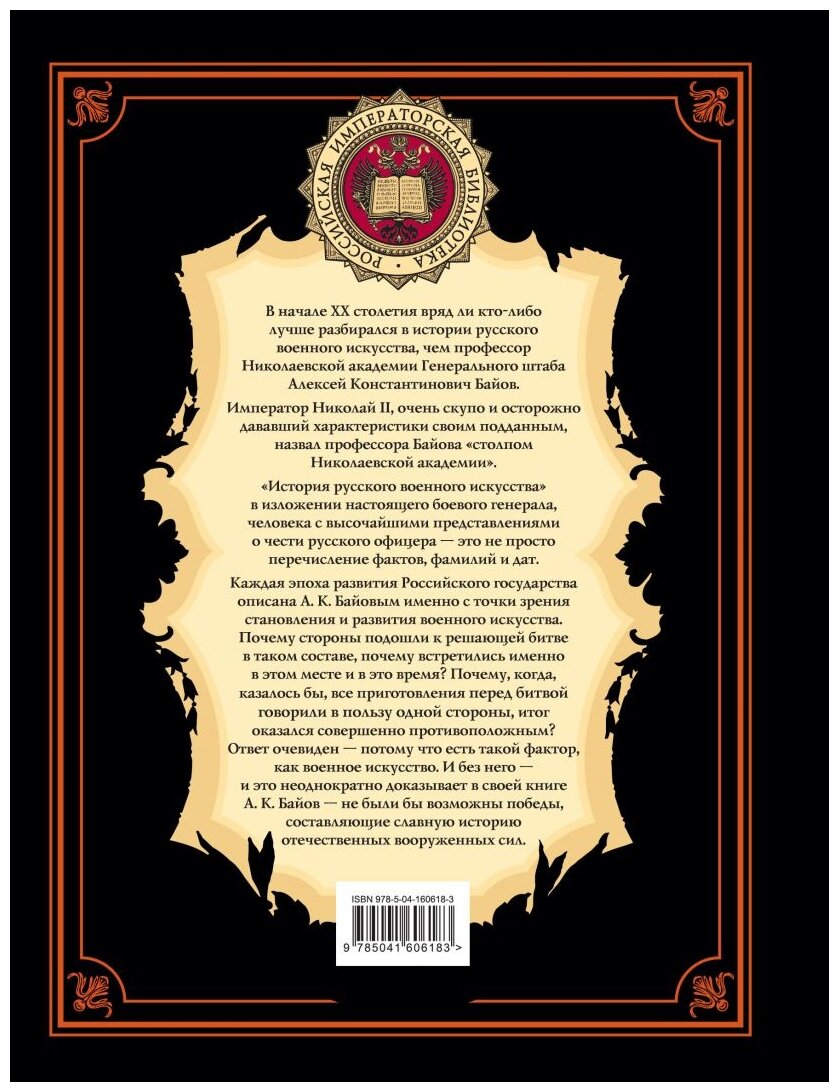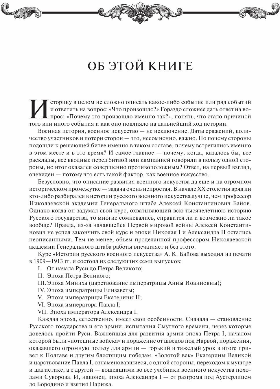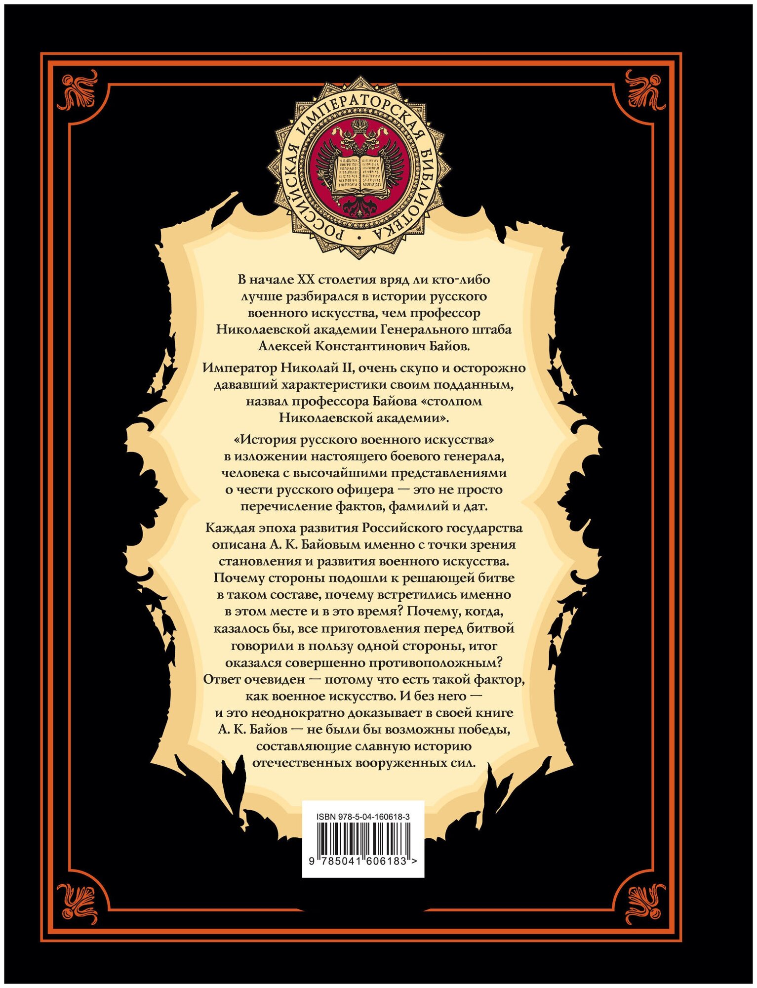 "История русского военного искусства" в изложении настоящего боевого генерала, человека с высочайшими представлениями о чести русского офицера - это не просто перечисление фактов, фамилий и дат. Каждая эпоха развития Российского государства описана А. К. Байовым именно с точки зрения становления и развития военного искусства. Почему стороны подошли к решающей битве в таком составе, почему встретились именно в этом месте и в это время? Почему, когда, казалось бы, все приготовления перед битвой говорили в пользу одной стороны, но итог оказался совершенно противоположным? Ответ очевиден - потому что есть такой фактор, как военное искусство. И без него - и это неоднократно доказывает в своей книге А. К. Байов - не были бы возможны победы, составляющие славную историю отечественных вооруженных сил.