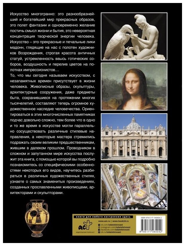 То, что мы сегодня называем искусством, с незапамятных времен присутствует в жизни человека. Живописные образы, скульптуры, архитектурные сооружения, даже предметы быта, сохранившиеся на протяжении многих тысячелетий, составляют теперь огромное художественное наследие человечества. Ориентироваться в этих многочисленных памятниках подчас довольно сложно, тем более что в одно и то же время в искусстве могли параллельно сосуществовать различные стилевые направления, а некоторые мастера стремились подражать своим великим предшественникам, жившим в далеком прошлом. Проводником в сложном и запутанном мире искусства послужит эта книга, с помощью которой вы подробно познакомитесь со специфическими особенностями некоторых его видов, научитесь разбираться в различных художественных стилях, узнаете о самых знаменитых произведениях, созданных прославленными живописцами, архитекторами и скульпторами.