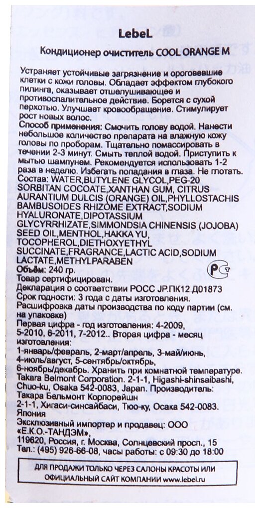 Кондиционер очиститель COOL ORANGE scalp conditioner М Lebel/Лебел 130г Такара Бельмонт Корпорейшн (1638600)