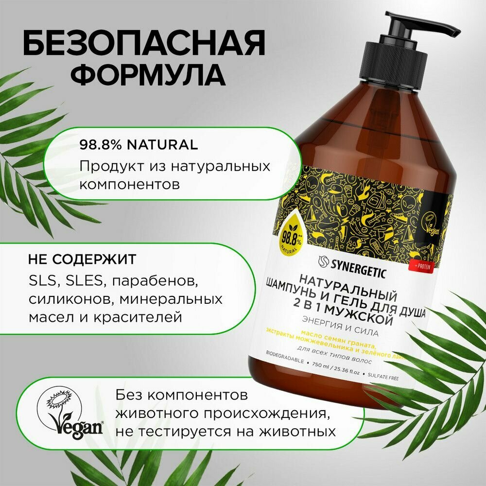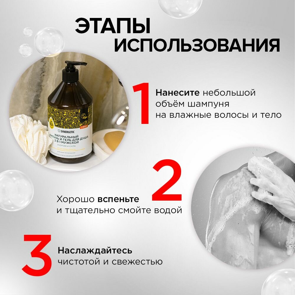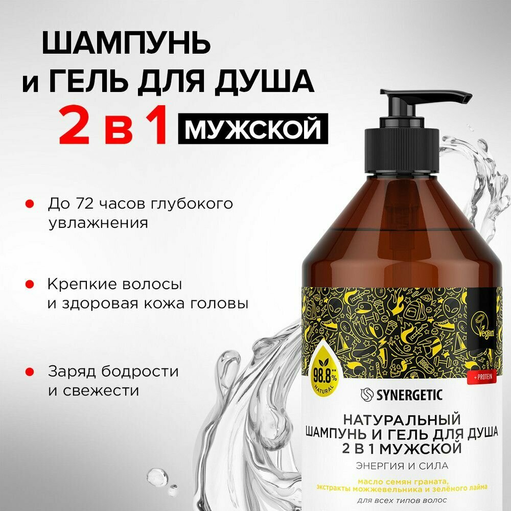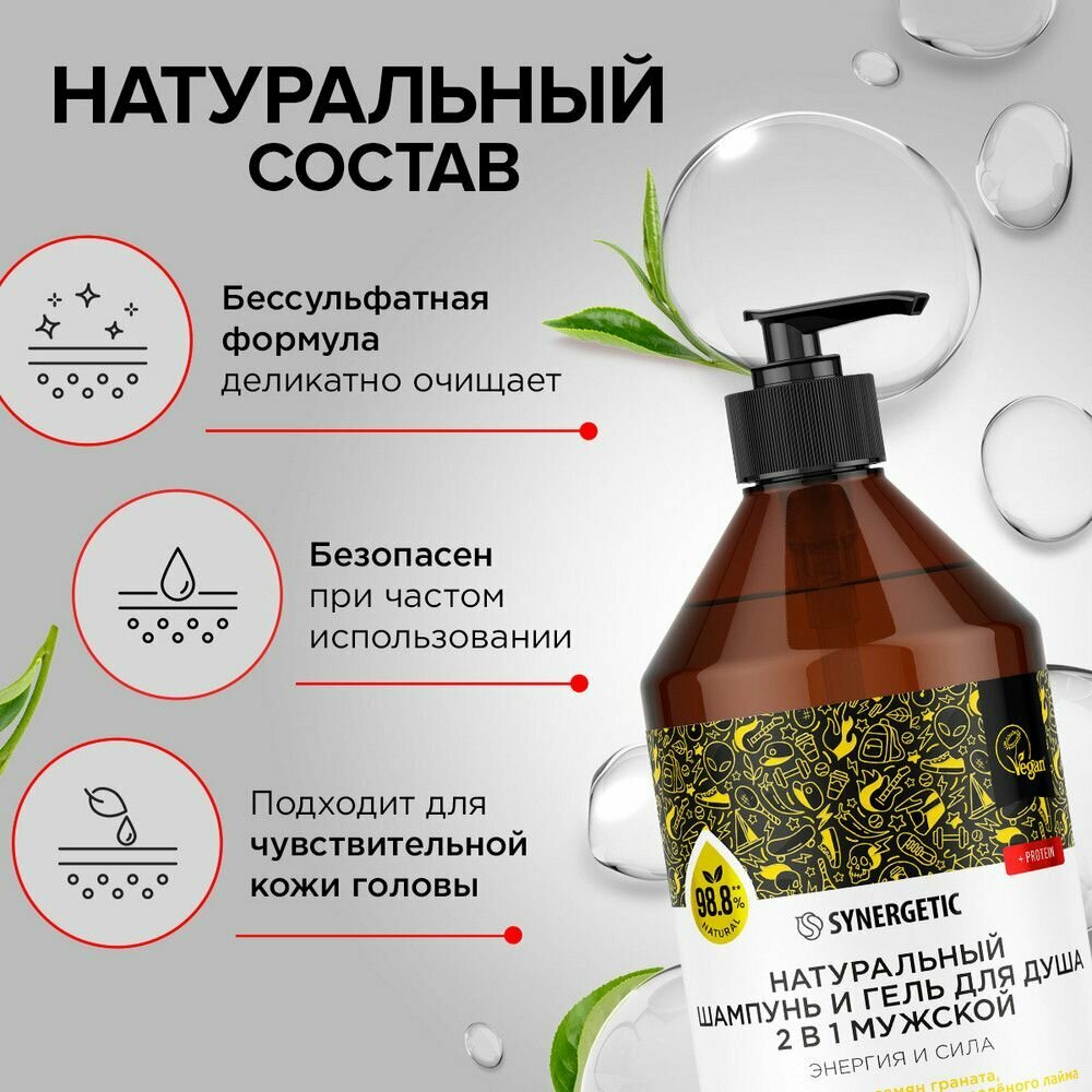 Бессульфатный мужской шампунь и гель для душа «2 в 1» SYNERGETIC «Энергия и сила» — эффективное средство для очищения тела, кожи головы и всех типов волос — более чем на 98% состоит из натуральных компонентов.