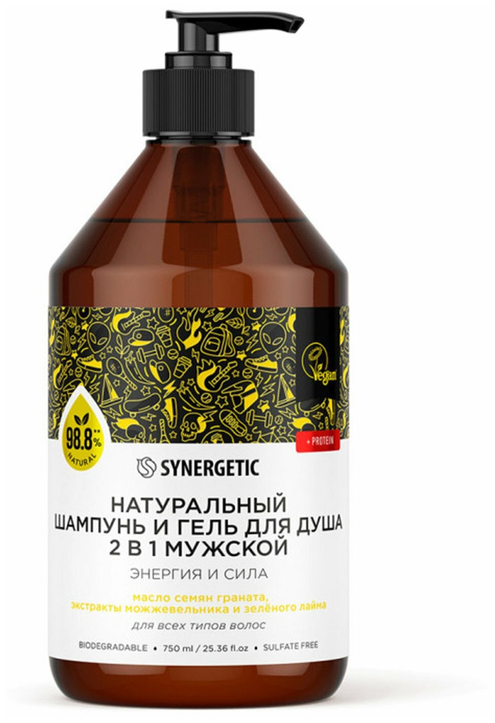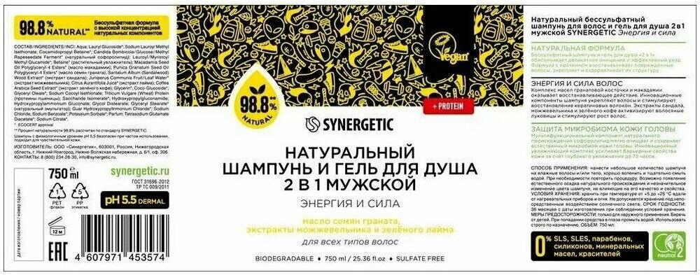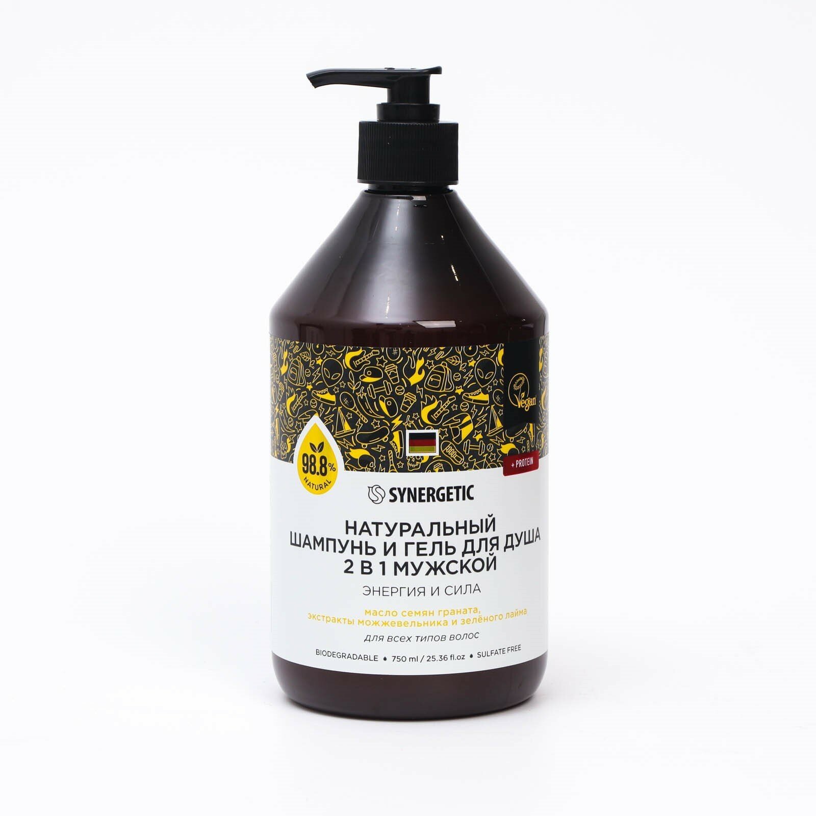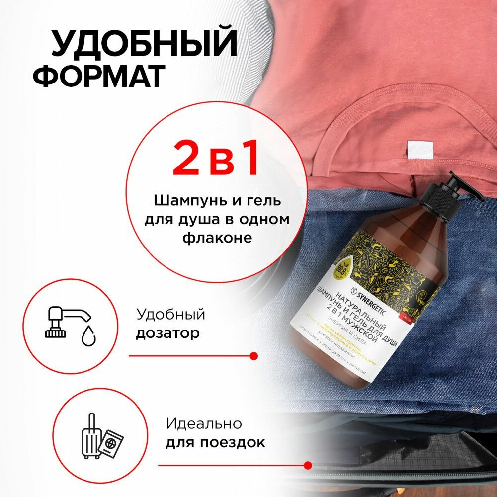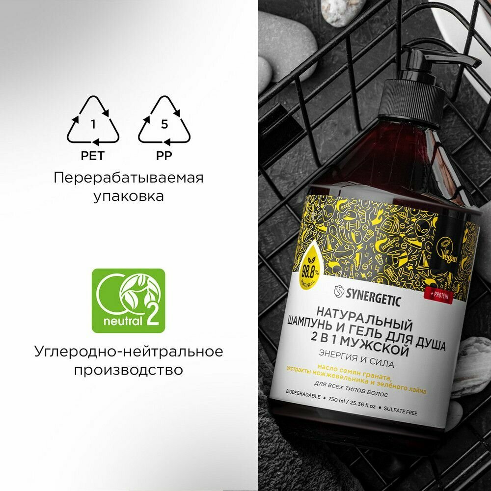 Бессульфатный мужской шампунь и гель для душа «2 в 1» SYNERGETIC «Энергия и сила» — эффективное средство для очищения тела, кожи головы и всех типов волос — более чем на 98% состоит из натуральных компонентов.