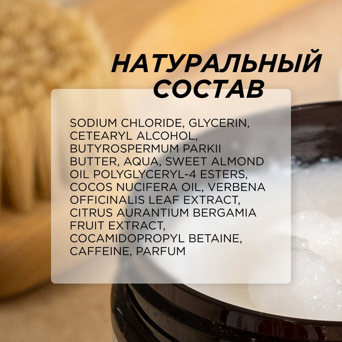 | Состав | Sodium Chloride (соль), Glycerin* (увлажняющий компонент растительного происхождения), Cetearyl Alcohol*(натуральный загуститель), Butyrospermum Parkii Butter* (масло карите), Aqua (вода), Sweet Almond Oil Polyglyceryl-4 Esters* (масло миндаля), Cocos Nucifera Fruit Oil* (масло кокоса), Verbena Officinalis Leaf Extract (экстракт листьев вербены лекарственной), Citrus Aurantium Bergamia Fruit Extract (экстракт бергамота), Cocamidopropyl Betaine* (мягкий ПАВ из кокосового масла), Сaffeine* (природный антиоксидант и стимулятор), Parfum (парфюмерная композиция на основе эфирных масел). * ECOCERT approval |