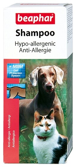 Беафар шампунь "Hypo-allergenic" противоаллергенный для собак и кошекГипоаллергенный шампунь Shampoo Hypo-allergenic для кошек и собак, страдающим от частых аллергических проявлений и после использования обычного шампуня. Шампунь представляет собой жидкость светло-желтого цвета без запаха. Шампунь не содержит ингредиентов, способных вызвать аллергию, очищает кожу и шерсть, не нарушая естественный защитный слой, снимает раздражение и успокаивает воспаленную кожу. Диметилсульфон (MSM) — натуральный источник гипоаллергенной серы, которая обеспечивает здоровье кожи и шерсти, укрепляет естественные защитные свойства кожи против аллергенов, снижает аллергическую реакцию, укрепляет корни волос и делает шерсть мягкой и блестящей. Состав Вода, лаурилсульфат натрия-2, хлористый натрий, PEG-40 касторовое масло, PEG-4 рапсовое масло, диметилсульфон, натрий лаурет-11 карбоксилат, амид жирной кислоты кокосового масла DEA, дистеарат гликоля, лаурил-2-гидроксипропил-тремитил-аммоний хлорид, гидрофосфат натрия, 1,2 пропанедиол, дигидрофосфат калия, 5-бромо-5-нитро-1,3-диоксан. Смочить шерсть теплой водой и нанести шампунь, мягко массируя до образования пены. Оставить на 2–3 минуты, тщательно смыть, при необходимости повторить, а затем просушить шерсть полотенцем. В случае попадания шампуня в глаза, уши, нос и пасть животного тщательно промыть их водой.