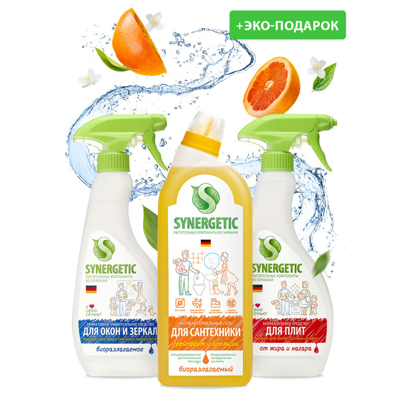 | Состав набора | 1. Средство для мытья стёкол 500мл. 2. Средство для сантехники «Грейпфрут и апельсин» 0,7л. 3. Средство для кухонных плит 500мл |