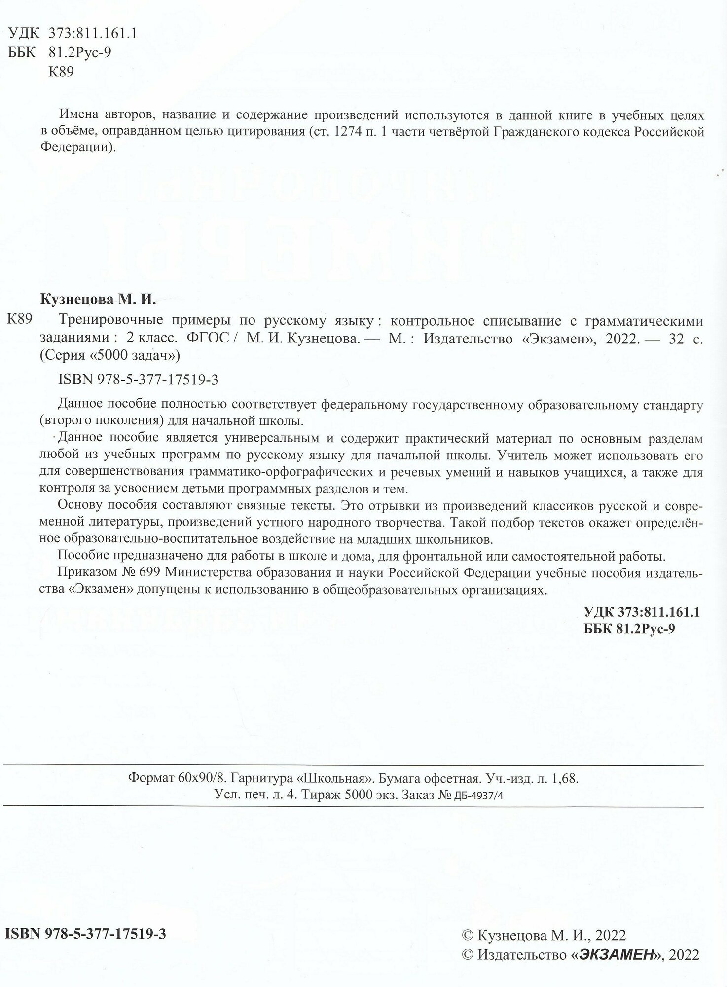 Тренировочные примеры по русскому языку. Контрольное списывание с грамматическими заданиями. 2 класс (Марта Ивановна Кузнецова); Экзамен, 2022