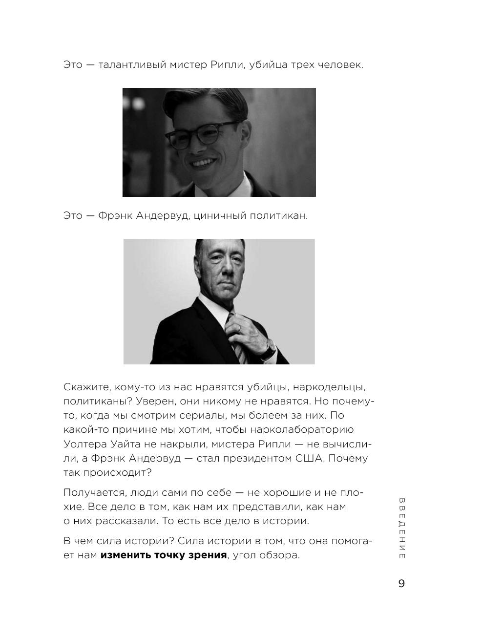 В книге всё строится на примерах из различных сериалов. К слову сказать ни один сериал я не смотрела, но тем не менее это не влияет на восприятие описанной информации.