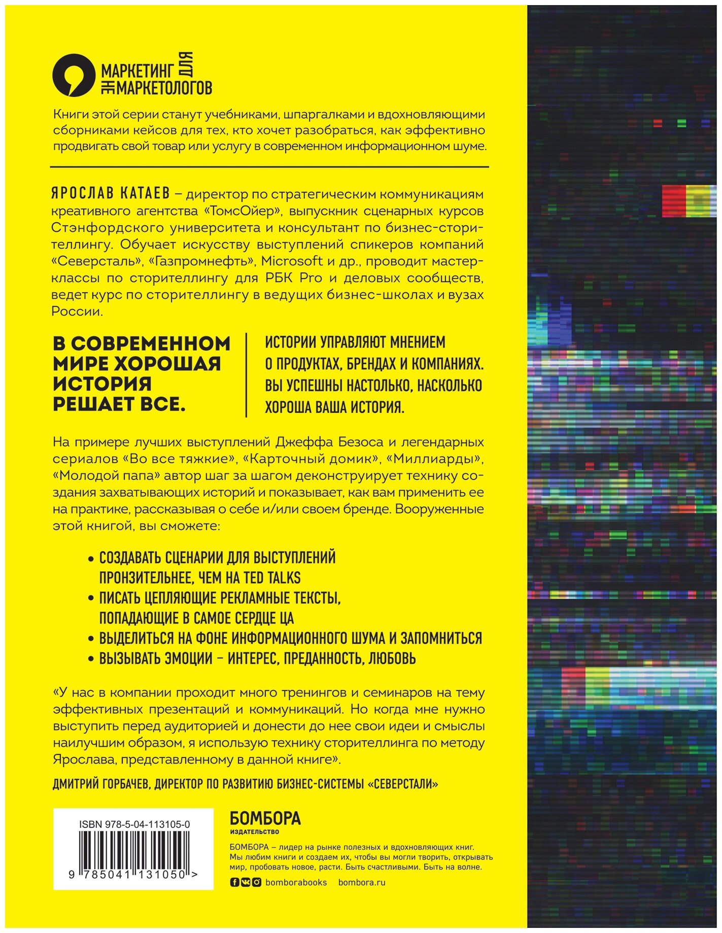Ярослав Катаев — директор по стратегическим коммуникациям креативного агентства «ТомсОйер», выпускник сценарных курсов Стэнфордского университета и консультант по бизнес-сторителлингу. Обучает спикеров "Северсталь", Microsoft Russia, "Газпром нефть", и др., ведет курс по сторителлингу в ведущих бизнес-школах и вузах России. В современном мире хорошая история решает всё. Истории управляют мнением о продуктах, брендах и компаниях. Вы успешны настолько, насколько хороша ваша история. На примере лучших выступлений Джеффа Безоса и легендарных сериалов «Во все тяжкие», «Карточный домик», «Миллиарды», «Молодой папа», автор шаг за шагом деконструирует технику создания захватывающих историй и рассказывает, как вам применить ее на практике. Вооруженные этой книгой, вы сможете: • Создавать сценарии для выступлений, пронзительнее, чем на TED talks. • Писать цепляющие рекламные тексты, попадающие в самое сердце ЦА. • Выделиться на фоне информационного шума и запомниться. • Вызывать эмоции — интерес, преданность, любовь. «У нас в компании проходит много тренингов и семинаров на тему эффективных презентаций и коммуникаций. Но когда мне нужно выступить перед аудиторией и донести до неё свои идеи и смыслы наилучшим образом, я использую техники сторителлинга по методу Ярослава, представленному в данной книге». — Дмитрий Горбачев, Директор по развитию Бизнес-системы «Северстали»