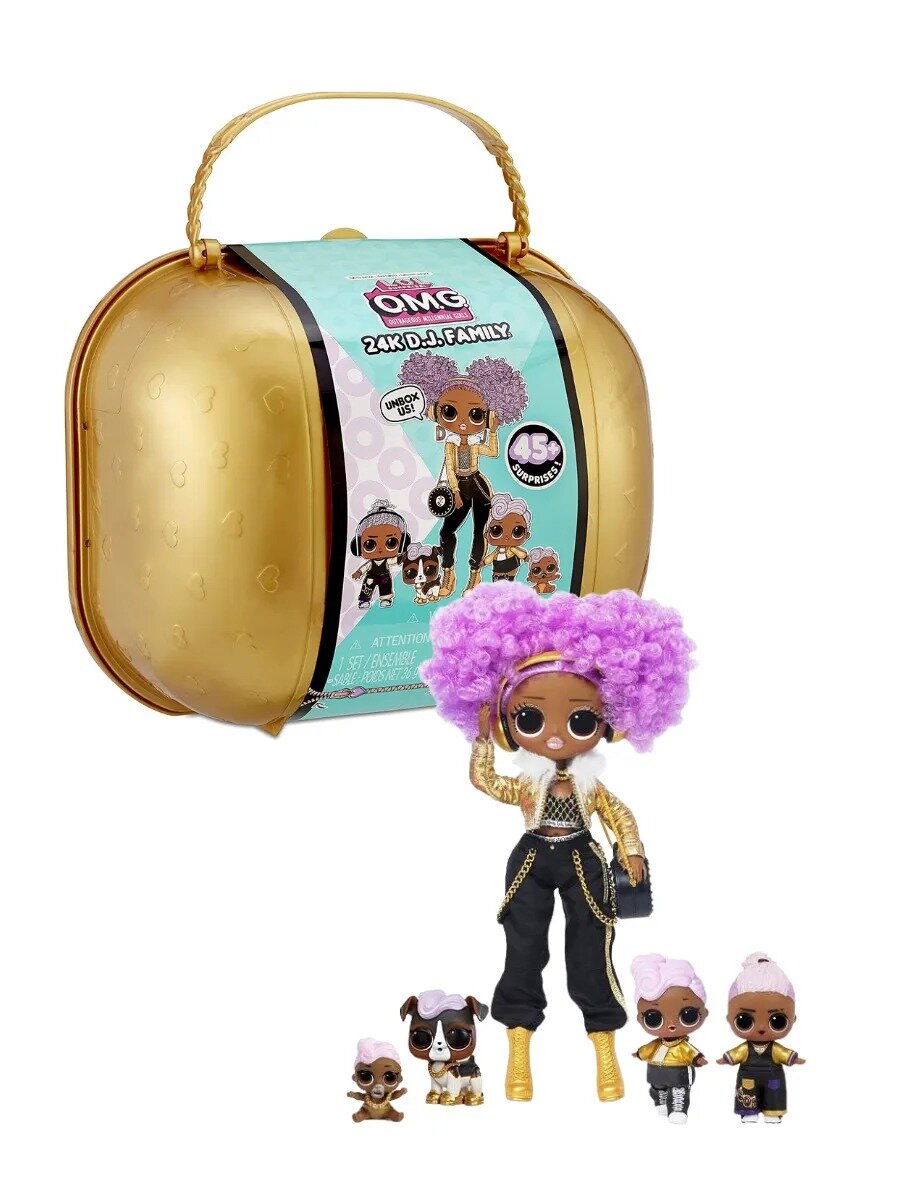 Большой чемодан в стиле LOL Surprise с семьей 24K DJ, который включает в себя большую куклу OMG с настоящими прошитыми волосами, сестричку, братика, пупса и питомца. Предметы одежды, обуви и аксессуары – всего более 45 сюрпризов – находятся под слоями упаковки. Сам чемодан имеет золотистый цвет и удобную для переноски ручку. Кукла 24K DJ с курчавыми ярко-сиреневыми волосами одета в коротки черно—золотистый топ с геометрическим орнаментом, черные брюки галифе с цепочками на карманах, золотую курточку с меховыми воротником и молнией, желтые высокие ботинки на шнуровке. Из аксессуаров есть наушники и модная сумочка. Маленькие куколки со светлыми молдированными волосами одеты в стиле старшей сестрички, а у пупса и питомца даже есть золотистые цепочки на шею. Аксессуары для большой куклы спрятаны с одной стороны чемодана, а маленькие куколки находятся в шарах ЛОЛ и в закрытых картонных отсеках другой части чемодана. В наборе: кукол сюрпризов чемодан-упаковка коллекционный гид