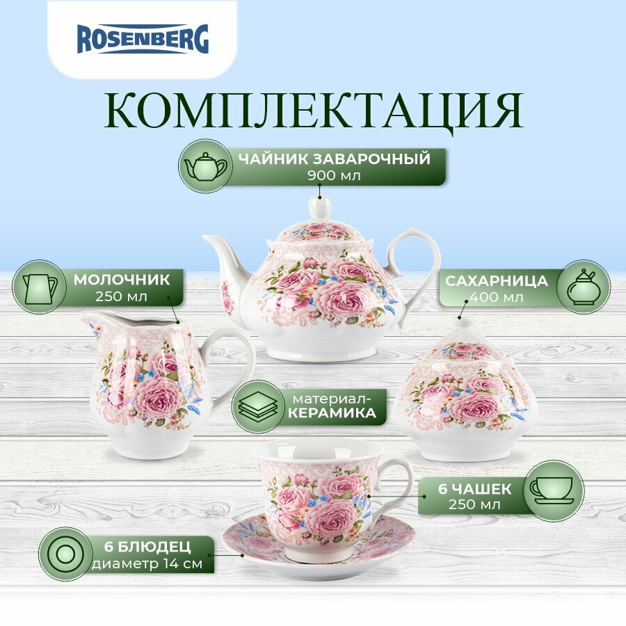 Чайный набор Rosenberg из 15 предметов станет прекрасным украшением Вашего стола и создаст атмосферу комфорта и уюта. В набор входит: 6 чашек (250мл) с блюдцами, чайник заварочный (900мл), сахарница и молочник. Материал керамика.