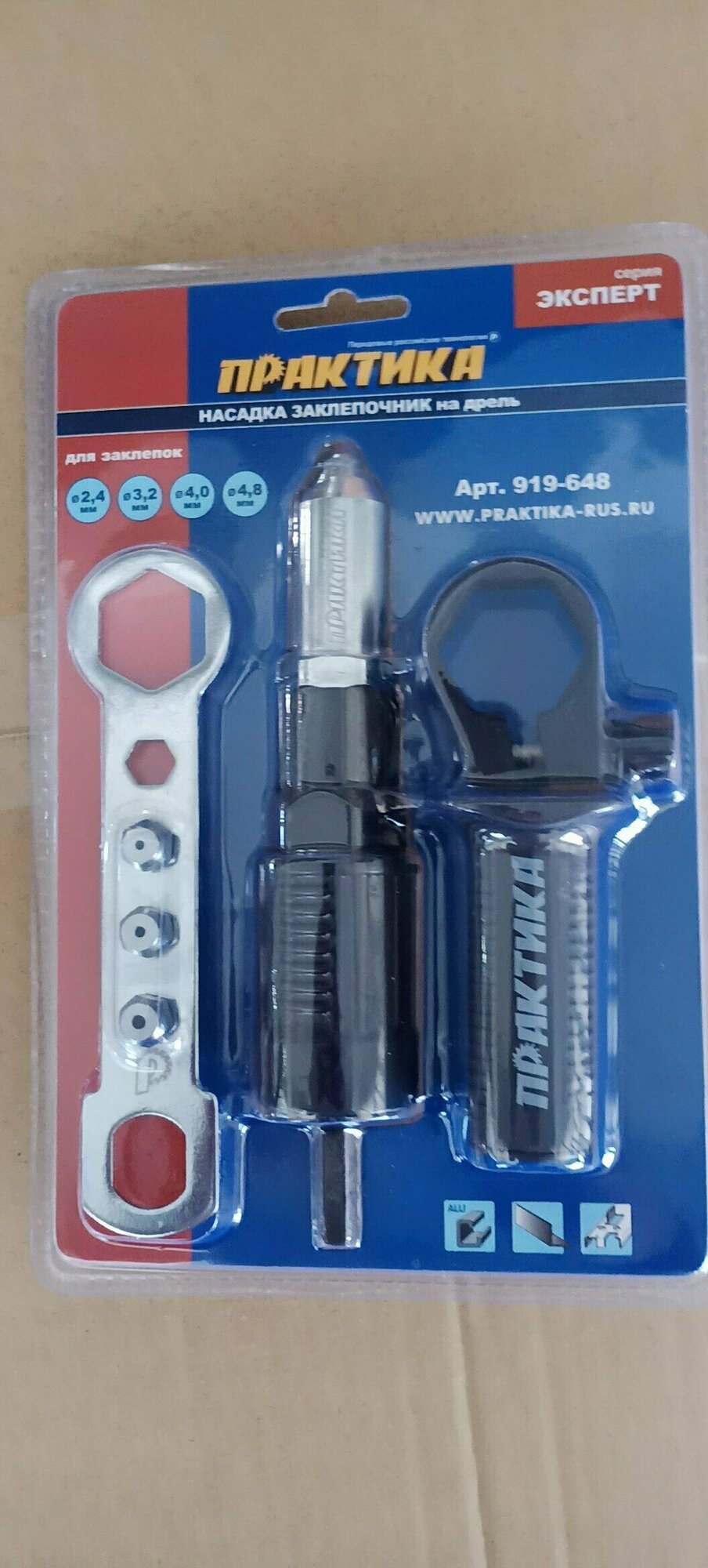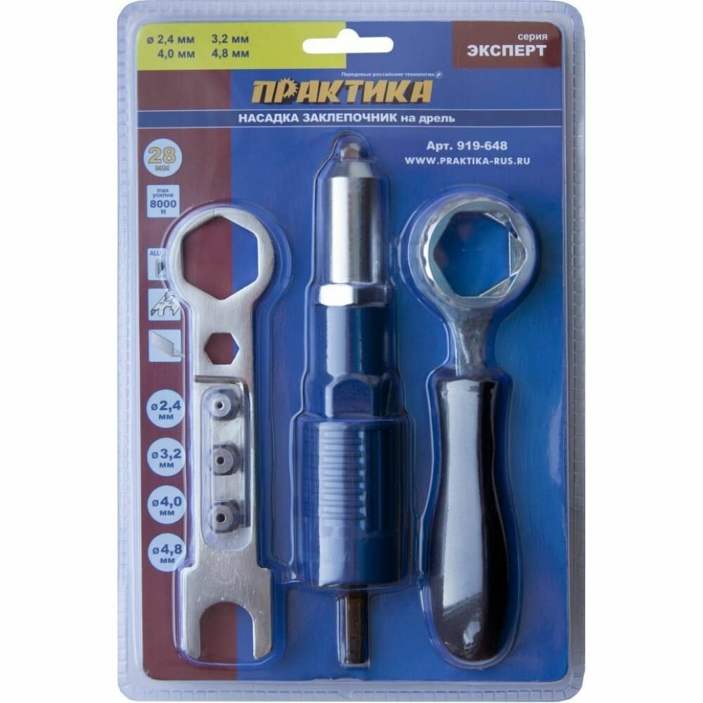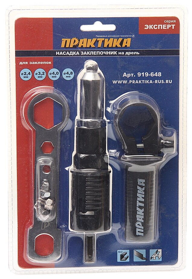 Насадка для шуруповерта для заклепок 2,4-4,8 мм ПРАКТИКА 919-648 позволяет устанавливать вытяжные заклепки при помощи дрели-шуруповерта, с функцией реверса.