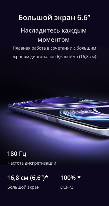 Экран IPS диагональю 6,6 дюйма разрешением Full HDДиагональ безрамочного дисплея составляет 6,6 дюйма, а разрешение – 2412 х 1080 пикселей. Он реалистично передаёт цвета и обеспечивает превосходную детализацию – вы легко разглядите мелкие подробности. Изображение обновляется с частотой 120 Гц, что обеспечивает особенно плавное воспроизведение динамичных сцен в играх. Даже с 6 различными частотами обновления для разных видов контента ваш смартфон сможет работать в энергосберегающем режиме.Емкий аккумулятор 5000 мАч Быстрая зарядка 18 ВтМощный аккумулятор емкостью 5000 мАч позволяет играть в течение 8 часов, Забыли зарядить? Не проблема. Быстрая зарядка 18 Вт поможет вам быстро вернуться в игру.Суперэнергосберегающий режимНе паникуйте если ваш смартфон начинает разряжаться. При уровне заряда всего 10% в режиме суперэнергосбережения вы еще долго сможете играть в любимые игры. При уровне заряда в 5%, вы все равно сможете использовать мессенджеры до 90 минут в режиме супер энергоэффективности, а смартфон способен работать 35,2 часа в режиме ожидания.