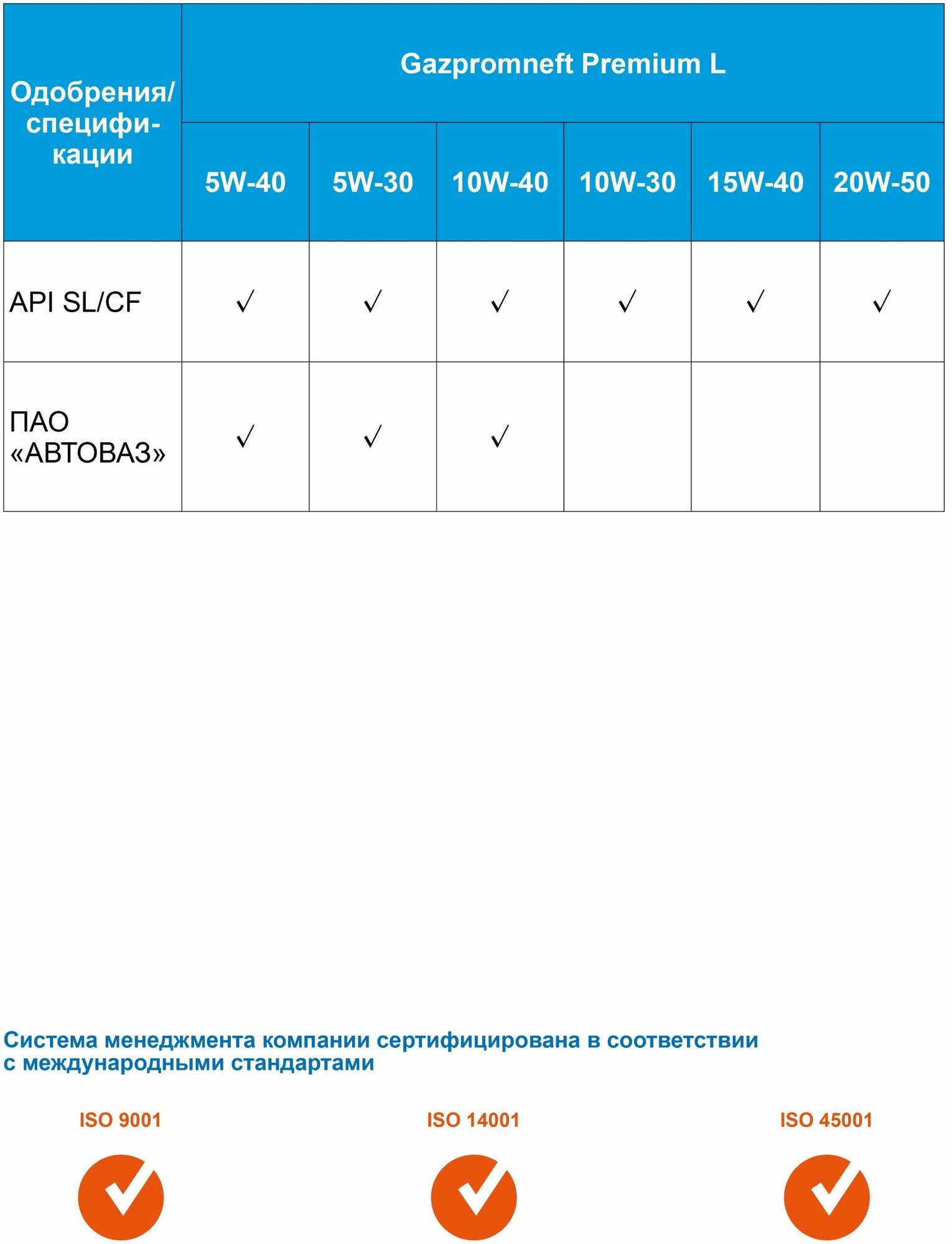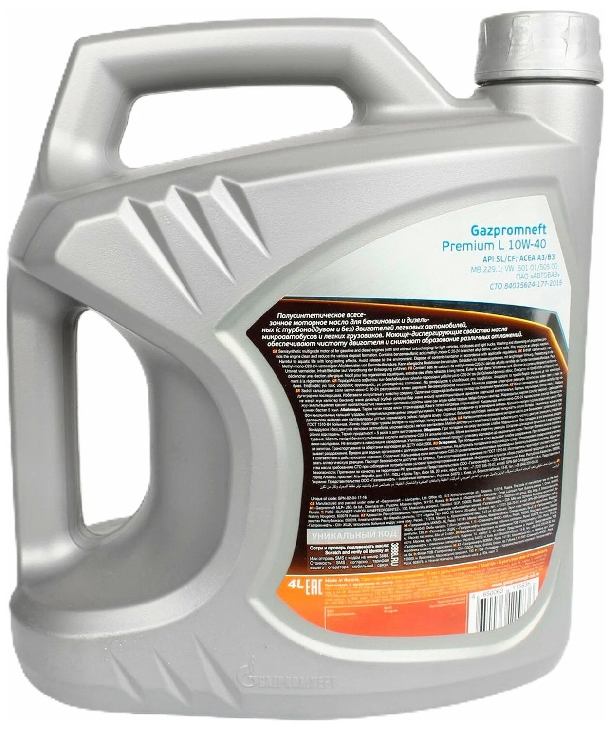 Gazpromneft Premium L 10W-40 - универсальное всесезонное полусинтетическое моторное масло, предназначенное для максимальной защиты бензиновых и дизельных двигателей легковой техники, работающее в различных условиях эксплуатации. Масло обеспечивает чистоту двигателя и высокую защиту от износа.