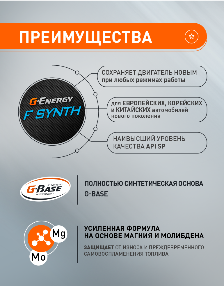Масло F Synth 5w-30 4л G-Energy 253140122 подходит для бензиновых и дизельных (с турбонаддувом и без) двигателей легковых автомобилей, микроавтобусов и легких грузовиков, где требуется масло с уровнем эксплуатационных свойств API SL/CF и ниже, а также ACEA A3/B4.