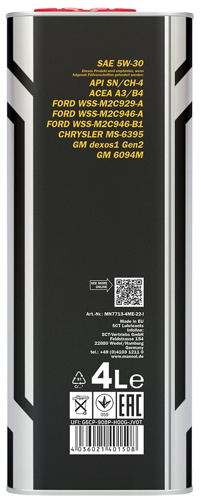 | Допуски OEM | FORD WSS-M2C946-B1, CHRYSLER MS-6395, GM dexos1 Gen2, GM 6094M |
