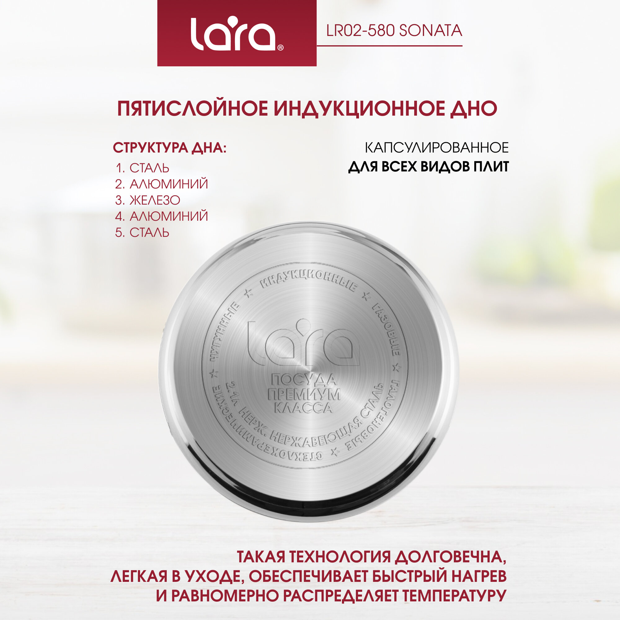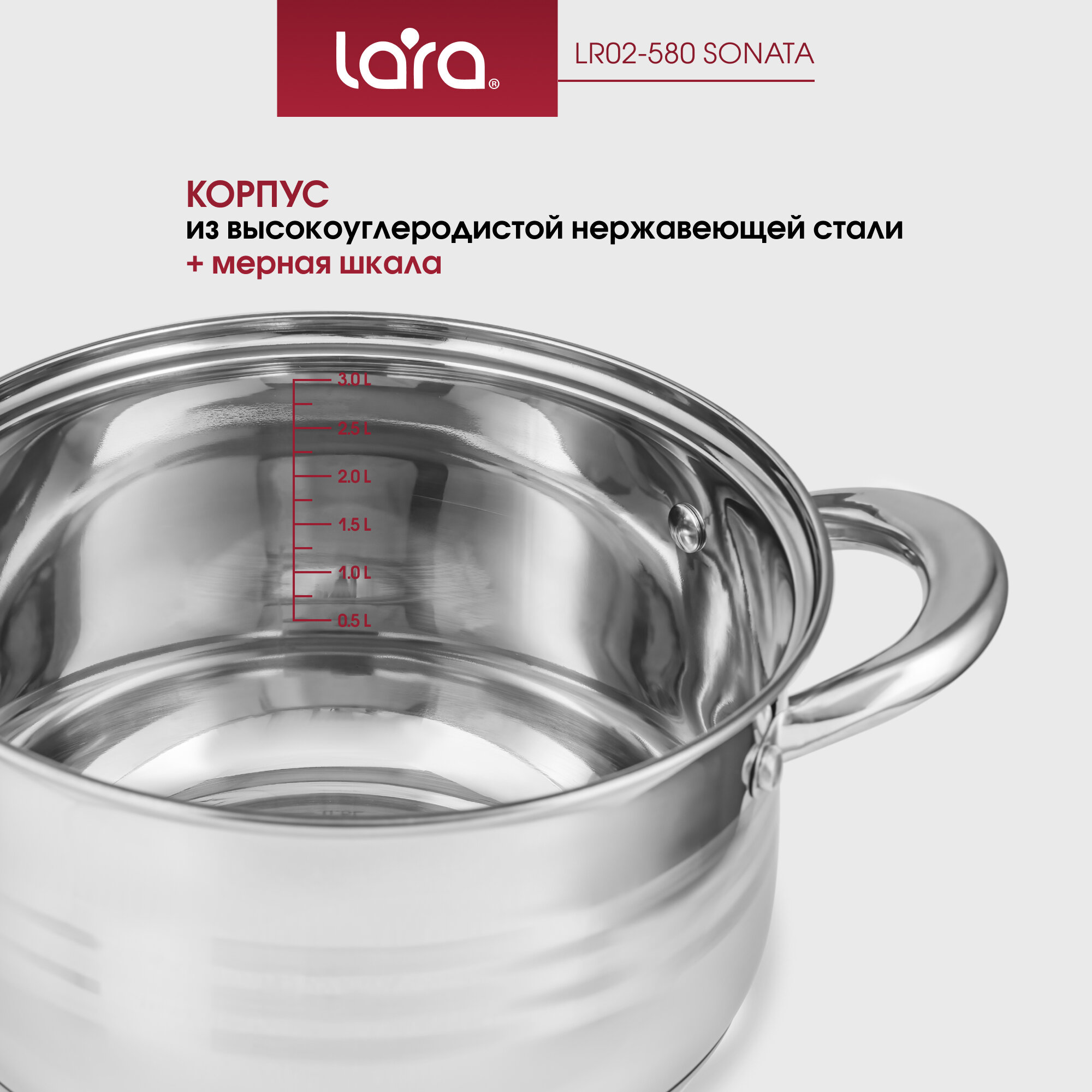 Кастрюля из нержавеющей стали-отличный вариант долговечной и прочной посуды, идеально подходящей для варки, тушения и запекания. Она проста в обслуживании, экономична, отлично сохраняет тепло и равномерно готовит продукты. Торговая марка Lara предлагает покупателю широкий выбор посуды для приготовления и кухонных аксессуаров. В ассортименте производителя долгие годы присутствуют кастрюли из нержавеющей стали и наборы кастрюль. Кастрюля из нержавеющей стали . Подробное описание: Цвет - Серебриcтый; Серия - SONATA; Объем кастрюли - 2,9 л; Диаметр предмета (см) - 18 см; Высота предмета (см) - 11,5; Т Материал посуды - Нержавеющая сталь AISI 201; Количество предметов в упаковке - 2; Комплектация - Кастрюля + крышка. Полировка - Зеркальная; Дно - Индукционное, Капсулированное; Мытье - В посудомоечной машине, Ручная мойка; Использование в духовке - Да; Отверстия для слива воды - Нет; Ручки - Нержавеющая сталь, Полые; Пятислойное капсулированное дно для равномерного разогрева, полная индукция, надежные массивные рукоятки со сниженной теплопроводимостью за счет трубчатой конструкции. Разборная ручка крышки для легкого удаления жира.