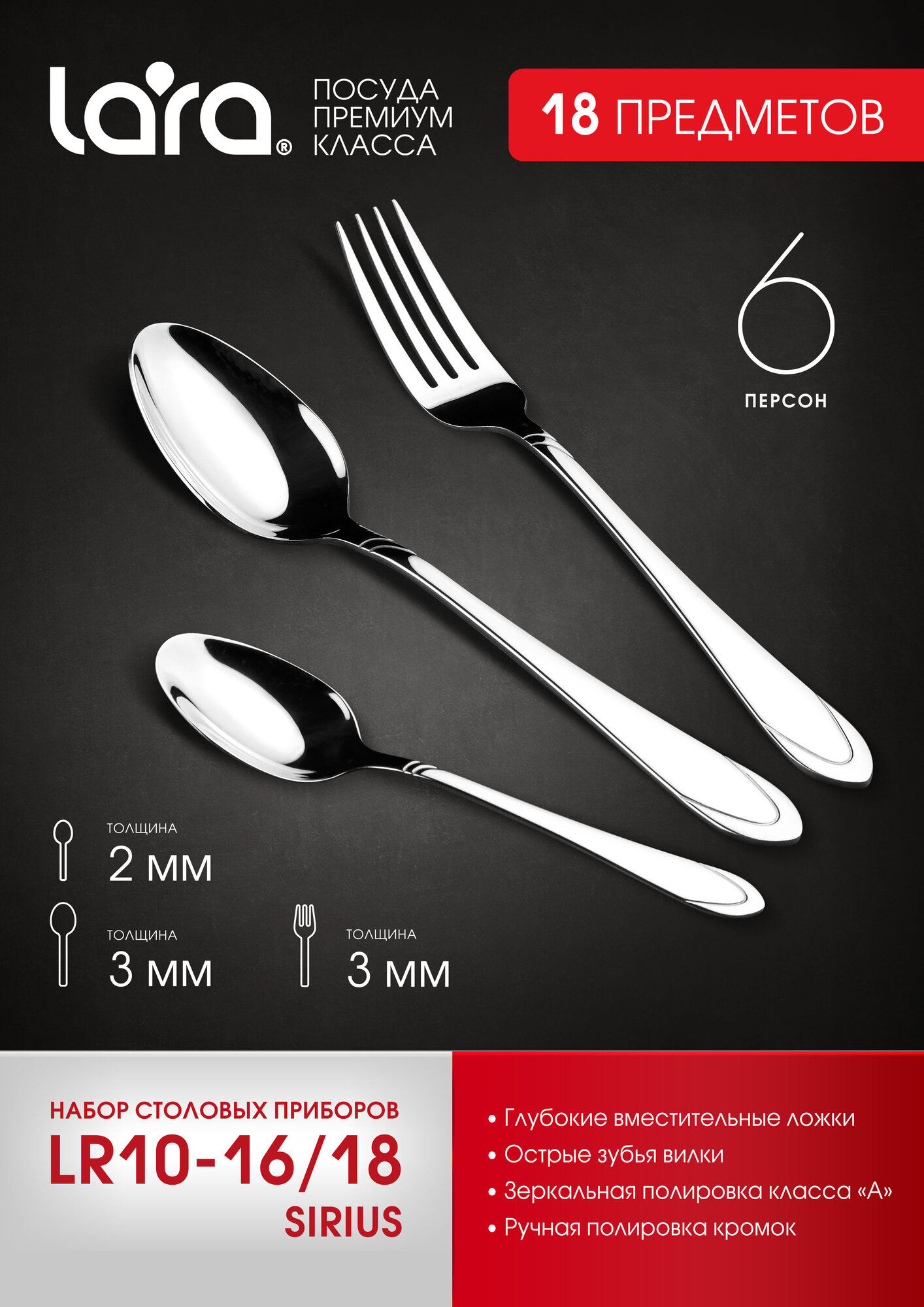 Набор столовых приборов Lara Sirius LR10-16/18 состоит из 18-ти предметов. Вы найдете 6 комплектов вилок, столовых и чайных ложечек. Благодаря элегантному и простому дизайну такие приборы подойдут для украшения праздничного стола или повседневного ужина. Изделия изготовлены из нержавеющей стали, обладающей устойчивостью к деформированию и износу. Набор Lara Sirius LR10-16/18 сохранит свою привлекательность даже через несколько лет активной эксплуатации. Вилки и ложки легко очищаются от загрязнений, подходят для мытья в посудомойке. Набор поставляется в красивой аккуратной упаковке. Срок службы: не ограничен