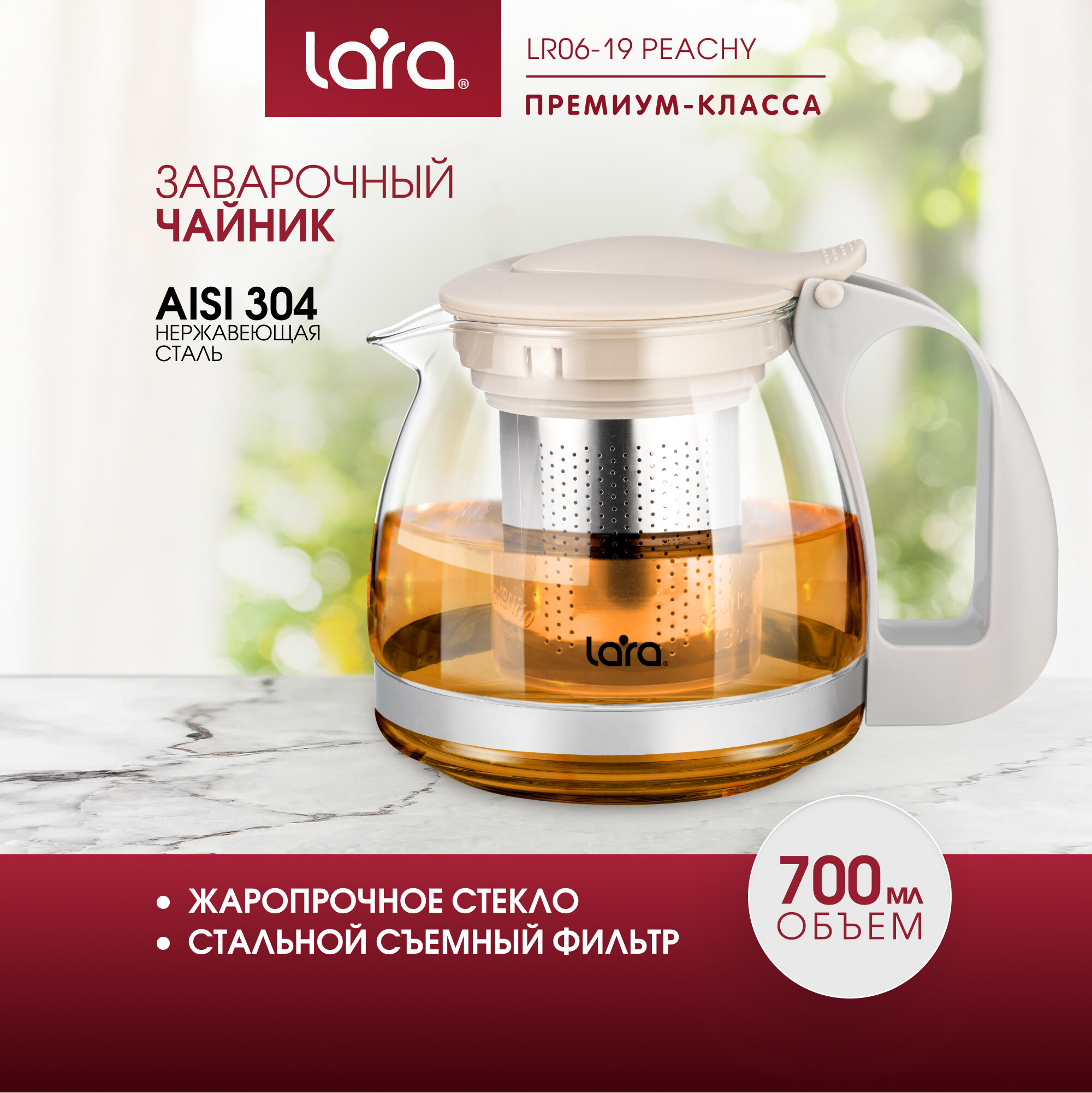 Чайник заварочный Lara объемом 0.7 литров. Изготовлен из нержавеющей стали, силикатного стекла и пластика. Хромированная отделка. Оснащен съемным фильтром.