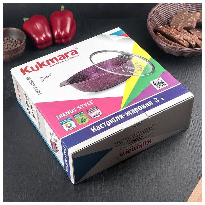 Посуда линии «Trendy style» разработана в соответствии с последними модными тенденциям. Кастрюля-жаровня “Kukmara” изготовлена из литого алюминия, покрыта с внутренней и с внешней стороны антипригарным покрытием увеличенной прочности, изготовленным на водной основе по немецким технологиям.