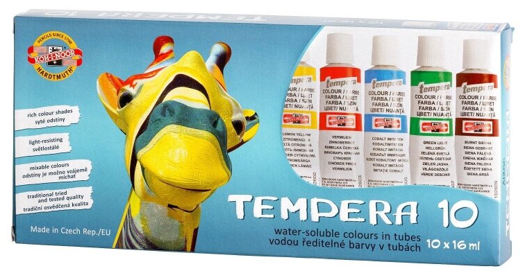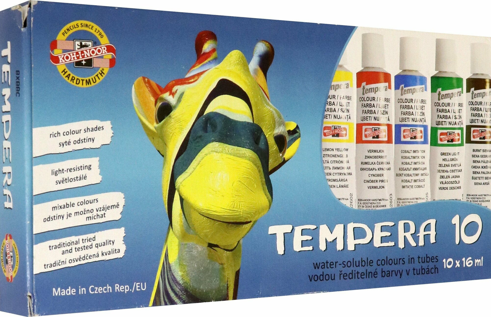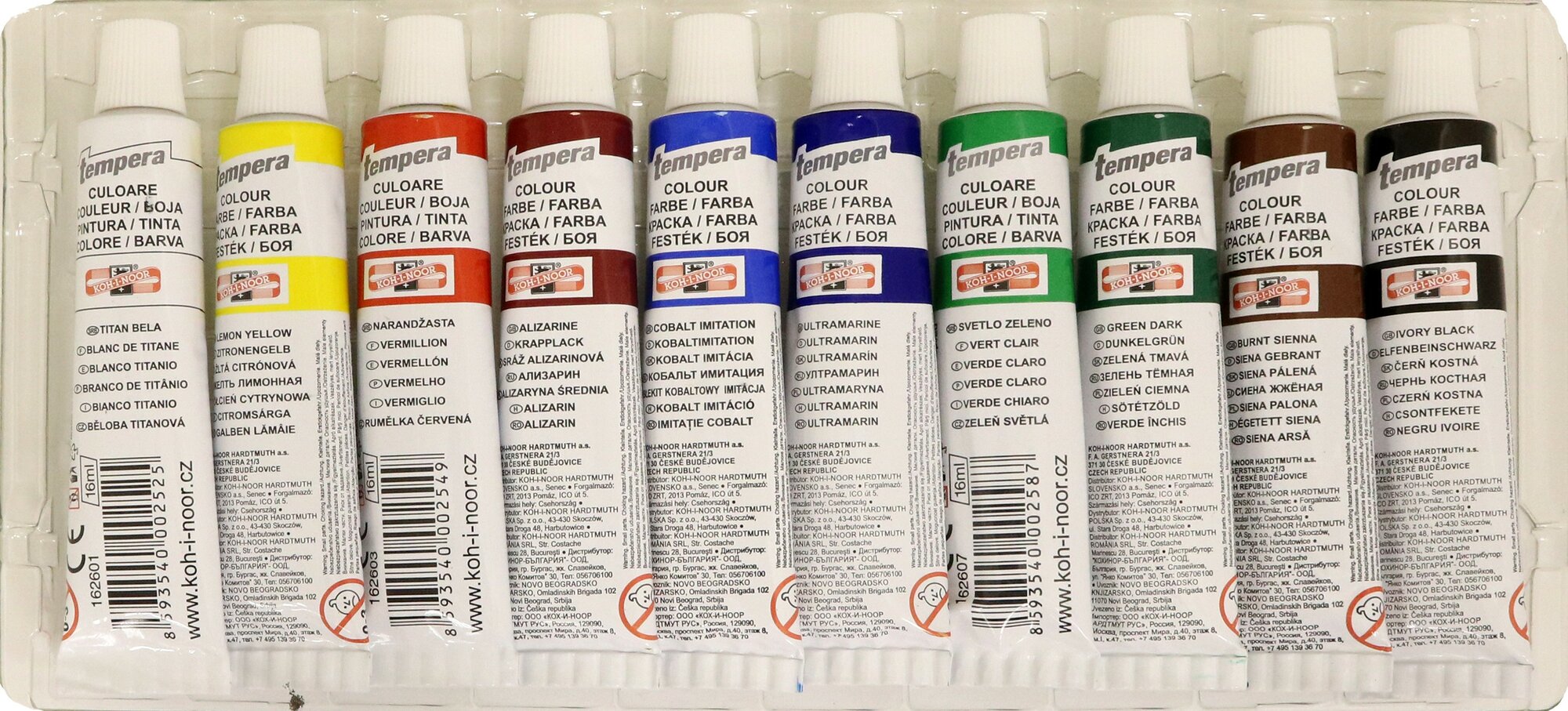 Набор темперных красок 10 цветов в тюбиках по 16 мл. Темперные краски Koh-I-Noor имеют яркие насыщенные пигменты, хорошо смешиваются между собой, быстро сохнут, после высыхания их снова можно разбавить водой.