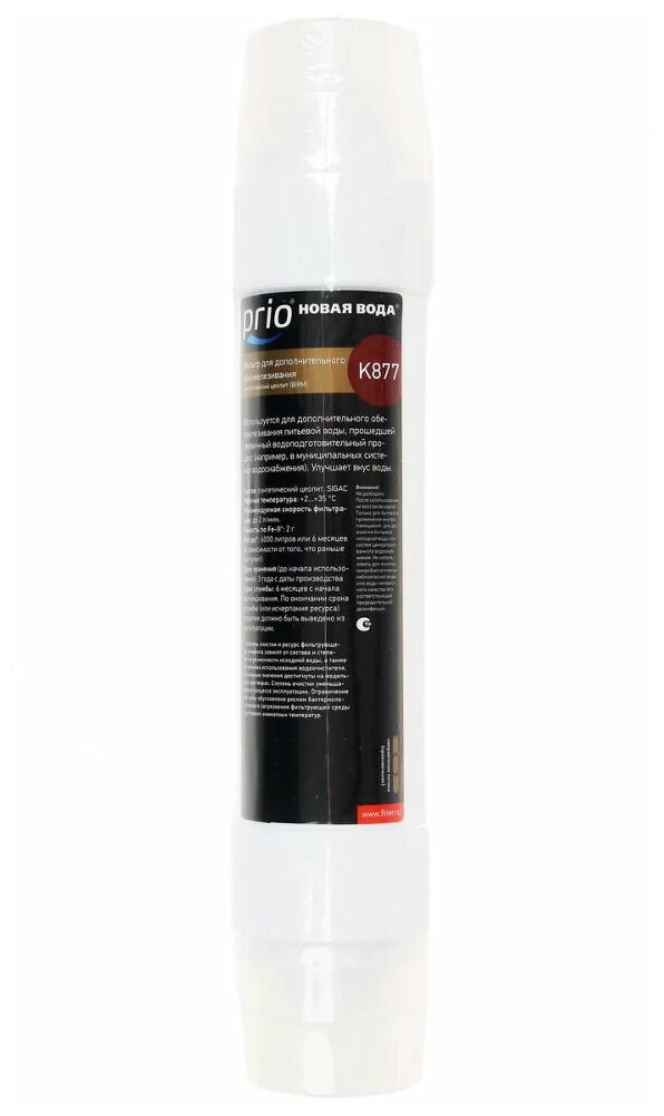 Фильтрующий элемент K877 используется в качестве третьей ступени фильтра Prio Новая Вода Expert М312. Используется для дополнительного обезжелезивания (удаления растворенного железа Fe2+) питьевой воды, прошедшей первичный водоподготовительный процесс (например, в муниципальных системах водоснабжения). Улучшает вкус воды.