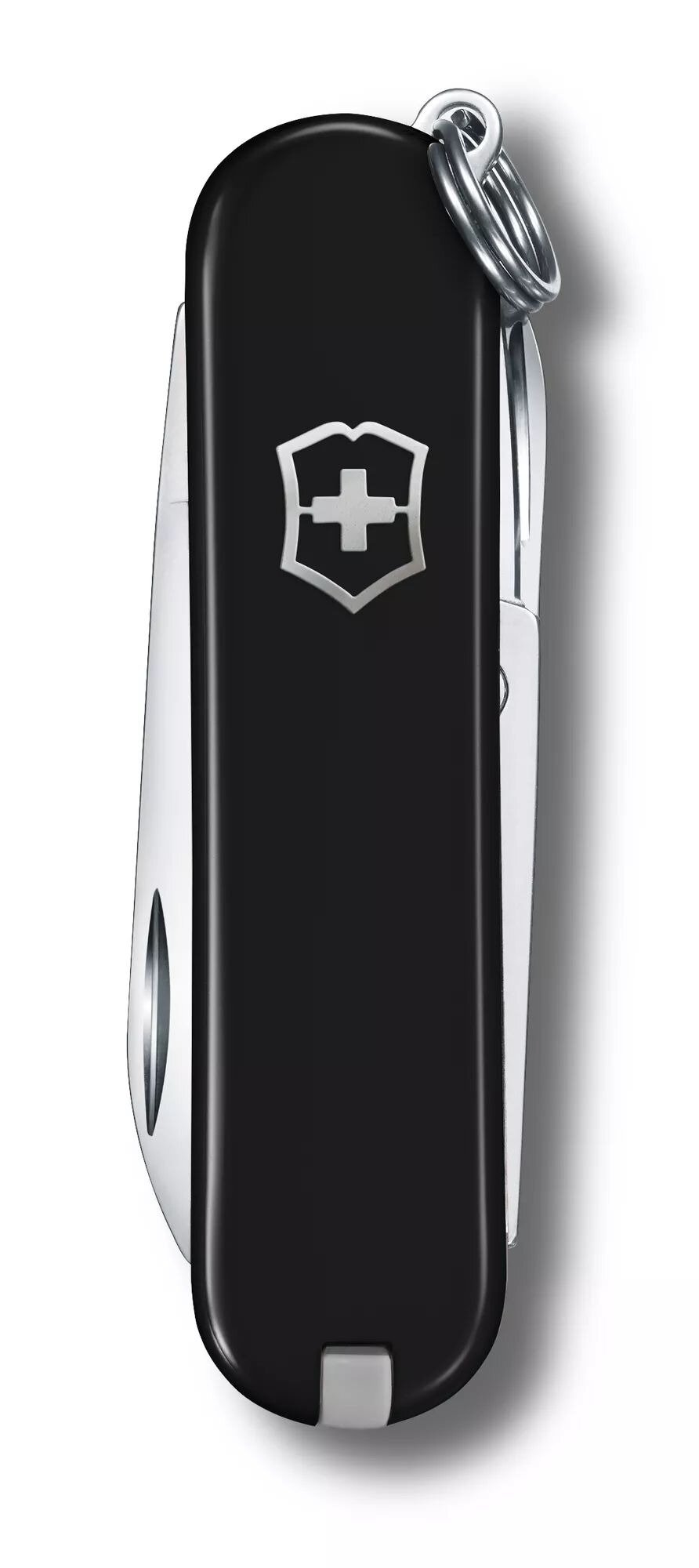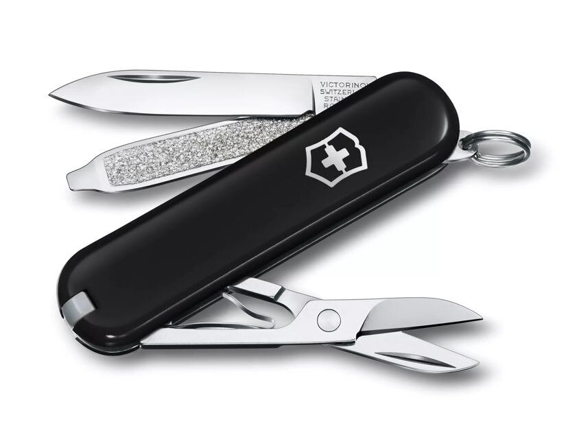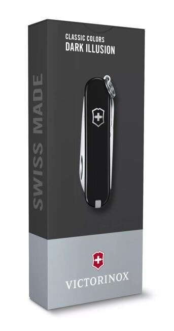 Нож со складным лезвием Victorinox Classic Dark Illusion черный, функций: 7, Лезвие, пилка для ногтей с плоской отверткой (также подходит для винта с крестообразным шлицем), ножницы, пинцет, зубочистка, кольцо для ключей, размер 58мм, длина лезвия 40мм ()