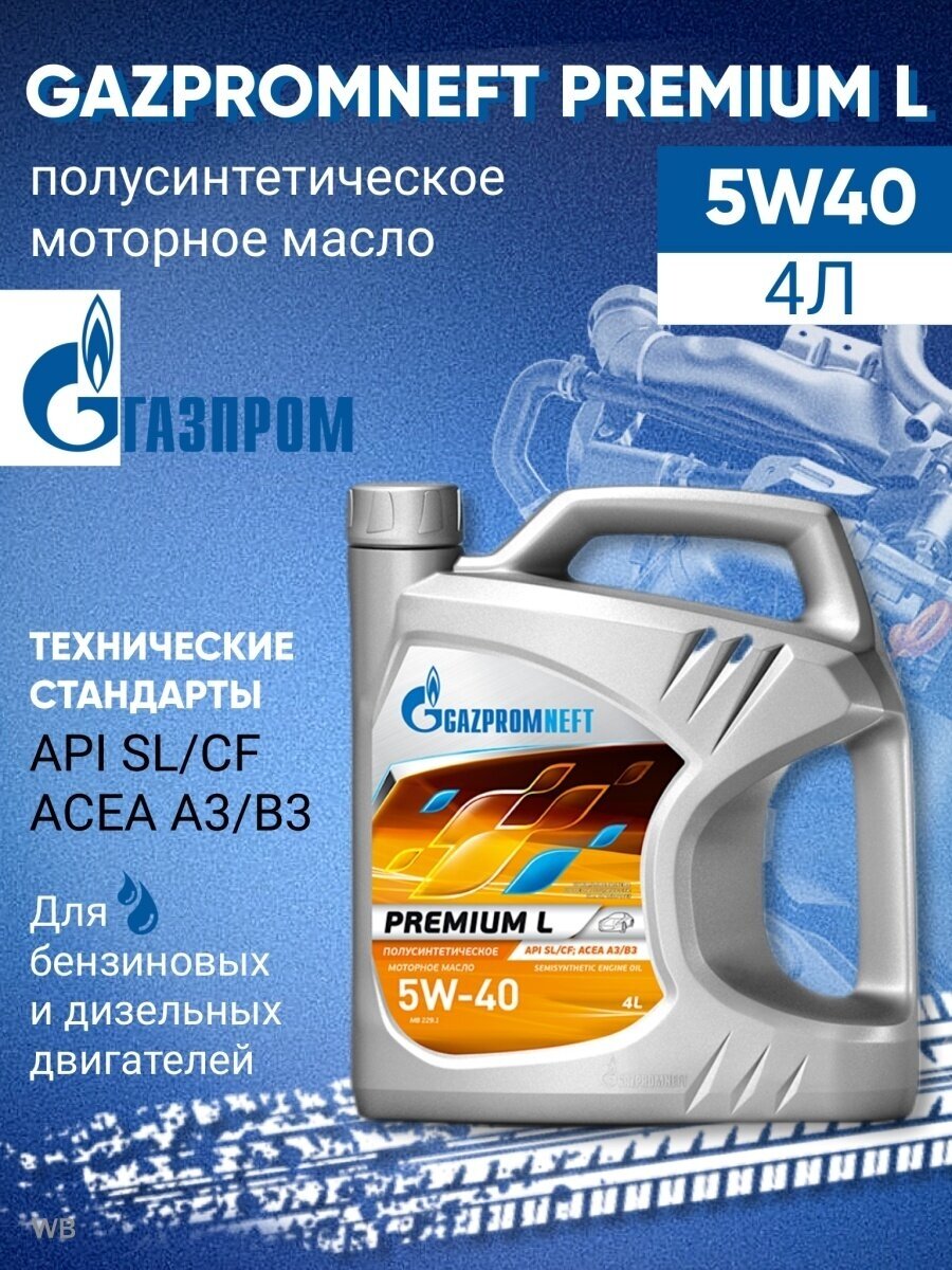 Gazpromneft Premium L 5W-40 - универсальное всесезонное полусинтетическое моторное масло, предназначенное для максимальной защиты бензиновых и дизельных двигателей легковой техники, работающее в различных условиях эксплуатации. Масло обеспечивает чистоту двигателя и высокую защиту от износа.