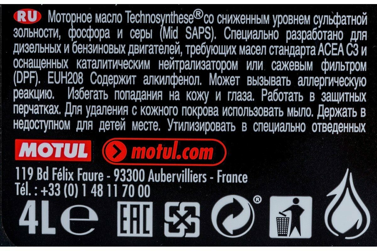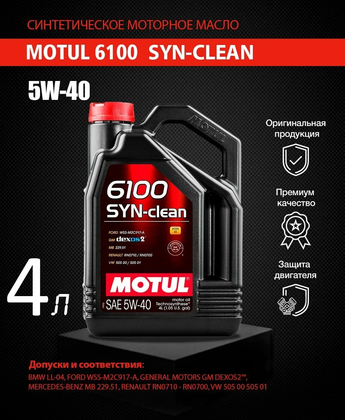 MOTUL 6100 SYN-clean 5W-40Моторное масло для бензиновых и дизельных двигателей стандарта евро 4, 5 и 6 Technosynthese®ПрименениеУсовершенствованное моторное масло Technosynthese® с высокими эксплуатационными свойствами.Рекомендовано для BMW, FORD, GM, MERCEDES, RENAULT и VAG (Volkswagen, Audi, Skoda и Seat).Специально разработано для автомобилей последнего поколения, оснащенных бензиновыми и дизельными, атмосферными и турбированными двигателями, в т. ч. с непосредственным впрыском, отвечающих требованиям норм Евро 4, 5 или Евро 6 и требующих использования в них «Mid SAPS» масла стандарта ACEA C3: масла с высокой вязкостью HTHS (> 3.5 мПа/с), сниженным содержанием сульфатной золы (≤ 0,8%), фосфора (0.07%-0.09%), серы (≤ 0.3%). Совместимо с каталитическими нейтрализаторами (CAT) и сажевыми фильтрами (DPF) системы доочистки выхлопных газов.