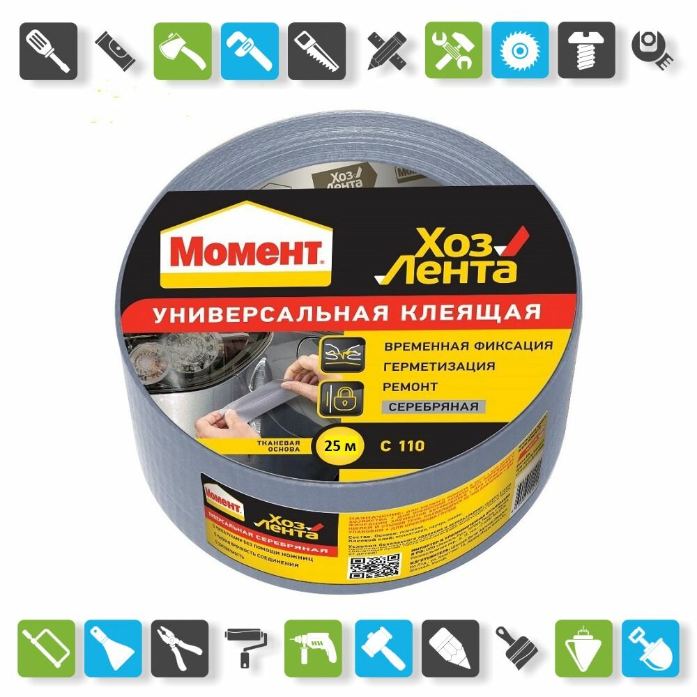 Хозлента Момент имеет серебристый цвет и адгезивную систему на тканевой основе. Лента удобна в использовании и легко рвется руками. Ее применяют для временного ремонта изделий, для упаковки, герметизации и изоляции.